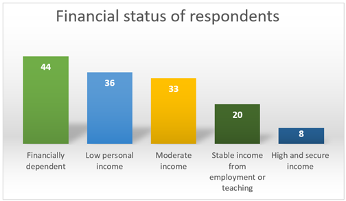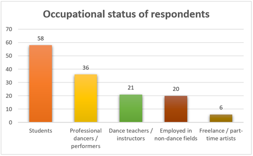 Status of Respondents The occupational profile indicates that the students constitute the highest number in the study. There are 58 respondents who have found themselves in this category and this means that a significant number of the participants are still learning in their academic or dancing professional lives. This is in line with the age factor, with the majority being at the age of young adults. In the second place, there are professional dancers or performers, 25.53 percent of the sample. This group includes representatives of people who are working in the sphere of performance-based careers and practice of dances. In the third position is the third largest segment of 14.89 percent; dance teachers and instructors. Their presence is a manifestation of skilled professionals who are engaged in the transfer of knowledge and training. The non-dance sector (that is those who do not do dance as a profession) occupies 14.18 percent, which indicates that there are some practitioners who are in a position of balancing dance with other jobs. The least group is made up of freelance and part time artists at 4.2 percent though this means that very few of them are seeking flexible jobs in dance or project-based jobs in dance. On the whole, the occupational spread indicates that there is involvement of learners, professionals, and educators which offers a wide view of attitudes in the dance community. Figure 7