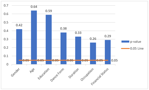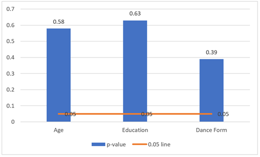 Figure 10 Between Association Between Attitude and Other Demographic Variables. The regression analysis shows that the attitude towards gender discrimination and age, education, and dance form do not have statistically significant correlation. There is no significant change in the attitude of the younger and older practitioners. This is not influenced by the level of education in terms of inclusivity perspective. The practice of the Bharatanatyam or any other kind of dance did not bring the attitude difference as well. This implies that these groups of demographics and professionals have the same perception regarding the presence of gender discrimination. 4. Results AND Discussion 4.1. Key Findings from the survey 1) Basic