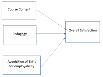 Comment: The p value for the effect of course content on Overall satisfaction is 0.025< 0.05. Hence it shows that the effect of Course content on Overall satisfaction is significant. Similarly, the p value for the effect of Pedagogy on Overall satisfaction is 0.035< 0.05. Hence it shows that that the effect of Pedagogy on Overall satisfaction is significant. Also, the p value for the effect of ‘Skills for employability’ on Overall satisfaction is 0.029< 0.05. Hence it shows that effect of ‘Skills for employability’ on Overall satisfaction is significant. 6.1. Path Diagram