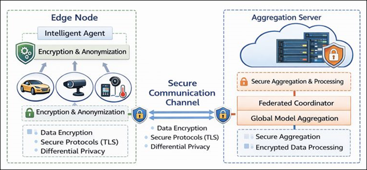 The proposed FMAI framework has security and privacy as the key design principles. There is also the use of secure communication protocols that are used to safeguard model update when relaying between edge agents and the federated coordinator. The methods of encrypted channels, secure aggregation, and authentication methods ensure the unauthorized access and manipulation. Figure 2 illustrates a safe federated learning process with intelligent agents at the edge node which encrypt and anonymize local data before communicating to a different intelligent agent in the edge node. The models are updated through secure channels to the aggregation server, which does encrypted global aggregation. This design will guarantee confidentiality, no exposure of raw data and will provide privacy protecting intelligence throughout smart city IoT structures.