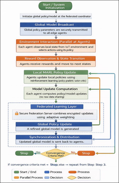 As indicated by Table 1, the change is a transition of centralized and edge-based analytics to federated and multi-agent intelligence of smart city IoT systems. Federated learning has a higher privacy, but the current methods have scalability, coordination, and non-IID data issues. By combining multi-agent intelligence with federated learning, it is possible to process large amounts of data in an adaptive, autonomous and privacy-conscious way. 3. Proposed Federated Multi-Agent Intelligence Framework 3.1. Proposed System Architecture and Agent Deployment at IoT Edges The suggested Federated Multi-Agent Intelligence (FMAI) system implements a hierarchical edge-federated architecture that is capable of addressing scalability, low latency, and privacy protection in smart city IoT systems. On the bottom layer, there are heterogeneous IoT devices, including sensors, cameras, smart meters, vehicles, which are linked to surrounding edge nodes. The nodes of the edges possess an intelligent agent that is in charge of local data processing, learning, and decision-making. These agents are autonomous but coordinated to have a federated learning layer that is installed on regional or city-level aggregation servers. The Figure 1 shows a hierarchical federated multi-agent architecture in which the intelligent agents are used at the edge nodes of the IoT to do local learning and make decisions. Updates to models are safely distributed to a federated coordinator to be aggregated globally and provide scalable, low-latency and privacy preserving intelligence over heterogeneous smart city services. Figure 1 |