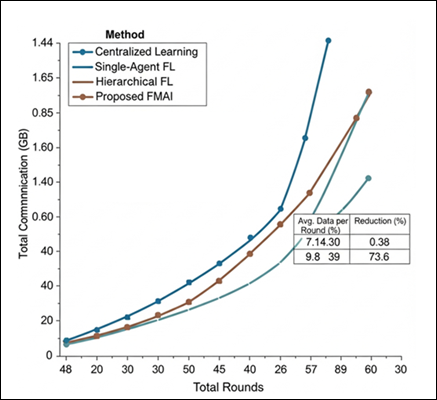 The Figure 6 is the comparison of total communication cost as the training rounds increase with various learning paradigms. Centralized learning has a high communication growth rate whereas the federated strategy minimizes overhead. The FMAI proposed is the one that has the minimum cost of communication with the highest scalability, its update sharing and adaptive federated aggregation.