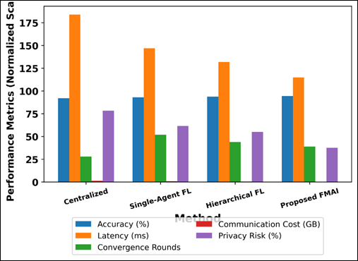 Concerning convergence, centralized learning is fast convergent but loses privacy and scalability. The number of rounds in single-agent federated learning is the most as it has non-IID data issues. Hierarchical federated learning is better at convergence efficiency, whereas FMAI is more balanced because it reaches the convergence after fewer rounds and it remains stable. The cost and privacy risk measures of communication highly support the suggested strategy. The lowest communication cost (0.38GB) and the least privacy risk (37.6 percent) are recorded in FMAI, which easily exceeds all the baselines. All these findings prove that FMAI provides high-quality trade-offs between accuracy, efficiency, scalability, and privacy. Based on these, the framework can be viewed as a holistic and a practical solution to the next-generation IoT smart city intelligence systems. As shown in the Figure 8, the proposed FMAI is the most accurate, has the least latency, lower communication cost, and the least risk of privacy, and it also converges efficiently which outperforms the centralized and the traditional ways of federated learning.