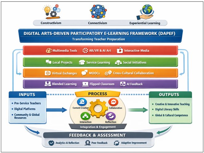 Figure 1 Framework for Digital Arts Driven Participatory E-Learning The Digital Arts -based Participatory E-Learning Framework (DAPEF) is created as a multi-layered conceptual framework that can transform teacher preparation as a traditional and stereotypical process into a creative, interactive, and global process. The model uses four main dimensions, which are digital arts, community engagement, global learning, and pedagogical innovation, to generate future educators that can be dynamic, creative and technologically competent. The first layer is the input level which is at the bottom of the framework and is concerned with the pre-service teachers and digital technologies and contextual resources such as the knowledge of the community and the international learning platforms. The first level is this layer, as in it the students are introduced to digital tools (e.g. multimedia software, AI-based creative tools, AR/VR experiences) and oriented towards collaborative and experiential learning. These inputs ensure that the training of teachers begins with introduction into the technology potential and the real world. It is a framework that is founded on three interrelated domains. The first one is digital arts integration that acts as the driving force of creativity and innovation. Digital storytelling, the development and design of interactive media and animation engage learners in the active process of knowledge creation and help them become digitally fluent. This domain advances the fact that creativity is not a topic of conversation, but a pedagogical tool. The second one is community engagement that defines the contextual and socially relevant learning. Pre-service teachers are teachers who participate in community based projects, service learning and participatory media in which knowledge in the classroom is connected to the real life issues. This will build an understanding, culturally aware and socially responsible personality, which is a pre-requisite of the modern day teacher. The third one is global learning that broadens the context of education with regards to the local situations. The model supports cross-cultural communication and exchange of learning through the global e-learning platforms, virtual exchange programs and international collaborations. The dimension will make teachers operate efficiently in multicultural environments that are very diverse to increase inclusiveness and global awareness. These three areas are where the layer of pedagogical innovation fits and supports the new current teaching practices which are blended learning, flipped classroom and participatory e-learning. The current stratum can ensure that the idea about the combination of digital arts and collaborative practice would be altered into the effective instructional design and learner-centered approaches. The process flow of the framework is a circle and repetition; it is based on content creation, collaboration, interaction, reflection, and adaptation. This cycle of process helps teachers to enhance practice through feedback and evolving learning needs. It also improves life time learning and development. Finally, the output layer is able to show the outputs of the framework including the improved creativity, the degree of digital literacy, the degree of pedagogical competence, the degree of global and cultural awareness. These are as well the outcomes that contemporary teachers in the 21st century are supposed to possess. 4. Methodology The research design proposed to be used in the study is a mixed method study in order to comprehensively examine the application of the proposed Digital Arts-Driven Participatory E-Learning Framework (DAPEF) in transforming the teacher preparation. To have an all-encompassing perspective on the role of digital arts, community engagement, and global learning in pedagogy development, the mixed-method method will be applied to combine both the quantitative and qualitative research methods. The integration of these techniques makes it simple to conduct data triangulation, which ensures enhanced validity and reliability of the findings. The research is conducted in the context of the tertiary education institutions offering teacher training programmes, particularly, the ones offering digital learning environment and creative courses. The target population will comprise of pre-service teachers enrolled in Bachelor of Education (B.Ed.) programs or equivalent programs and teacher educators and academic coordinators. The sample population that has already encountered digital tools or is engaged in the creative learning process will be identified via the purposive sampling. It will consist of approximately 100-150 pre-service teachers and 1015 faculty members in such a way that adequate numbers of both statistical analysis and qualitative data may be obtained. The study will be structured into three phases, that is, design and implementation, data collection, and assessment. DAPEF model is done during the first stage using structured intervention programme during 68 weeks. This period is characterized by a set of activities that are used by the participants based on the components of the framework. They include digital art production work (such as multimedia storytelling and visual design), community-based work (such as local cultural documentation or community social consciousness raising), and global collaborative work (such as virtual work or global group work with international students). The intervention is facilitated through digital platforms (Learning Management Systems (LMS), collaborative tools and virtual communication technologies). The data collection employs multiple instruments to capture quantitative as well as the qualitative aspect of learning. It is pre- and post-intervention surveys that identify the modification of the competencies of the participants, creativity, digital literacy, collaboration skills, and global awareness. The survey scales will be
