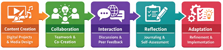 Figure 2 Participatory E-Learning Workflow The Figure 2 is cyclic participatory e-learning workflow which was embraced in the suggested framework. It begins with Content Creation whereby students develop digital projects through assistance of tools that are creative. It is followed then by Collaboration where the learners develop knowledge together and collaborate. Exchanging ideas is done during Interaction stage through the use of discussions and peer feedbacks. Then there is Reflection in which learners are able to perform self-reflection and journaling of their work. Finally, in Adaptation, the learners enhance and refine the work based on the feedback. It repeats itself again and the cycle goes on in an endless process of learning, enhancing and acquiring knowledge. 6. Results, Comparative Analysis, and Discussion The quantitative research shows that there has been a great improvement in the competencies of the participants upon the introduction of the DAPEF model. All survey outcomes of the pre- and post-intervention intervention indicate significant growth in the mean scores of all the parameters assessed. The level of creativity was enhanced because the participants were subjected to digital art activities like multimedia story telling and interactive design. On the same note, there was an increment in digital literacy scores because of the regular exposure to digital tools, platforms, and collaborative technologies. These improvements are statistically significant and proved with the help of paired t-tests and the fact that the proposed framework is effective. Along with the increase in creativity and digital skills, the level of cooperation and engagement improved significantly as well. During the collaborative stages of the model, the participants noted increased interaction, teamwork, and sharing of knowledge. Another tool that reinforced the level of engagement was the use of community-based projects to bridge the gap between learning and practice. Students were more motivated and actively engaged in doing socially relevant and culturally contextualized tasks. These findings are backed by the qualitative data that offers a better perspective of the experiences of the participants. The interviews and reflective journals indicate that the learners found the DAPEF model to be interactive, flexible, and learner-centered. Several responders noted that digital arts have become important in the process of making learning meaningful and interesting. The possibility to cooperate with peers and engage in global learning processes were also marked as one of the main strengths of the framework. Nonetheless, certain issues were identified, such as the initial trouble in adjustment to new technologies and lack of time to complete project-based assignments. A comparative-based analysis was made between the approach based on the use of the DAPEF and the traditional teacher preparation methods to better understand the effectiveness of the proposed model. The traditional methods are normally lecture based, theory based and constrained in regards to practical involvement. The DAPEF model on the other hand focuses on experiential learning, creativity and participation. The comparison indicates that the suggested model can be much more effective than the traditional approaches in terms of engagement, development of the skills, and the ability to work in digital settings. Table 2