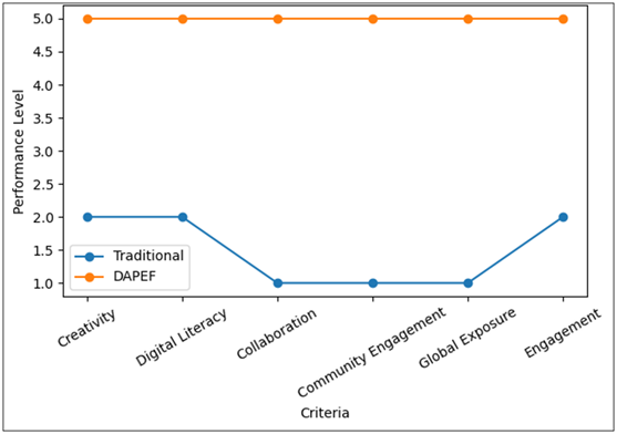 Figure 3 Comparative Analysis: Traditional Vs. DAPEF Model As can be noticed in Figure 3, there is a consistent improvement of the DAPEF model over the traditional approach in all dimensions but in collaboration, community engagement, and global exposure, the latter has the lowest scores. This is one of the strengths of participatory, digital-based arts learning. 7. Conclusion and Future Directions This paper discussed the potential transformations of teacher preparation through the proposed Digital Arts-Driven Participatory E-Learning Framework (DAPEF) involving integration of digital arts, community involvement as well as global learning. These findings reveal that the traditional teacher education models, which usually include theoretical learning and little practical learning, cannot be used to fulfill the requirements of the current digital and global learning settings. By comparison, the DAPEF model is a learner-centered and technology-enabled approach to teaching that is holistic and improves the teaching competencies and learning experiences significantly. The study results show that the application of the DAPEF framework results in significant changes in such main aspects of the study as creativity, digital literacy, collaboration, and global awareness. The model promotes creativity in thinking and, as a result, it allows the teacher to develop interesting and interactive learning activities by integrating digital arts in their pedagogical methods. Contextualized and socially valid teaching is achieved by the presence of community-based learning, and intercultural competence and readiness of educators to work in various institutional settings is facilitated by the inclusion of global learning environments. A key contribution to this study is that it has resulted in the creation of a conceptual framework that is structured and scalable, and bridges the gap between theory and practice in teacher education. Proposed model not only combines various aspects of current education but also offers a very definite workflow to be followed in its implementation, such as content creation, collaboration, interaction, reflection, and adaptation. The cyclical process facilitates the ongoing learning and professional growth and, this way, the framework can be changed based on the changing needs of education. Although the study has positive aspects, it has been noted to have some limitations. The effectiveness of the implementation of the DAPEF model will be contingent on the presence of the digital infrastructure, access to the technological means, and the willingness of the institutions and instructors to accept new methods of pedagogy. Moreover, the research was carried out under a certain educational setting which could restrict the extrapolation of the results to other areas or fields. The time was also a problem since some participants were not as digital savvy as others, and this created difficulty in the implementation process. Regarding the practical implications, the results indicate that training schools must focus on using digital art and participatory e-learning practices in training programs of teachers. The policy makers and curriculum designers are advised to install interdisciplinary methods that integrate creativity, technology and community involvement. Moreover, the professional development programs must be structured in such a way that they increase the level of digital competencies of the teachers and facilitate the implementation of innovative teaching strategies.