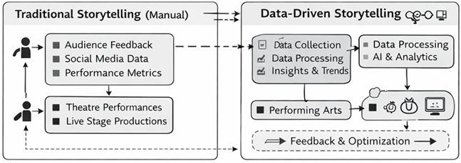 Figure 1 Comparative Models: Traditional Vs. Data -Driven Story telling in Performing Arts Figure 1 includes a comparative model demonstrating the disparities between the traditional storytelling and the data-driven storytelling in the performing arts. The traditional method involves a creative decision-making process that mostly relies on the intuition and experience of the artists, directors and performers with less structured information about the audience. After performances, feedback is usually obtained either by manual observations or casual feedback which is unlikely to have a major effect on building the story in a real-time setting Ge (2025). 2. Literature Review 2.1. Overview of Data-Driven Storytelling Data-driven storytelling is a process that involves the application of data analysis, visualization and computation to build meaningful stories. Performing arts traditionally depended on the intuition and creative interpretation of artists to perform the storytelling. Nevertheless, the fast development of digital technologies and analytics has changed the conceptualization and presentation of narratives. Data-driven storytelling involves merging analytical abilities and artistic innovativeness to come up with performances that are informed by the activity of the audience, cultural trends, and real-time interaction information. According to scholars, data may be not merely an information source but also a creative resource that can be used to create the art world. When information is rendered as a visual, sounding or performance, they are connected to the narrative structure itself. As an example, the live environmental input or social media feedback (or audience response data) can be used by the performance designers to affect the story development Ghobadi et al. (2025). 2.2. Technology and Digital Transformation in Performing Arts Introduction of technology in performing arts is a popular topic in scholarly literature. Initial studies were directed at applying stage technologies to the visual effect in the form of lighting systems, sound engineering, and projection mapping. As time passes, digital technologies have increased the options of the performance design by introducing multimedia features, immersive experiences, and interactive systems. Gurgenidze and Mamuladze (2017) New technologies like big data analytics, machine learning, and digital sensors have started to affect the practices of storytelling in theatre, dance, and music in the past few years. These technologies enable artists to gather and process information involving audience behavior, performer movement and performance conditions. As an illustration, motion capture can be used to capture the movements of the dancers and convert it to digital representations which can be used to form part of the storytelling process. On the same note, interactive projection systems can modify visual material according to the actions of the performers on stage. It is important to stress that technology in performance art cannot be regarded only as the technical contribution but as a tool that helps to increase the possibilities of creativity. Through implementing the digital technologies in the storytelling, artists can develop the hybrid performances that involve physical and virtual, which provide more immersive and engagements among the audience. Hashim et al. (2018) 2.3. Role of Data Analytics in Creative Industries The use of data analytic has gained more significance in different fields of creativity, such as film, music, video games, and performing arts. Data analytics allows organizations and creators to know the taste of the audience, forecasting trends as well as determining the success of creative products. Within the performing arts, the information collected with the help of ticketing systems, online tools, and audience interaction can be useful in understanding the audience demographics, engagement, and cultural interests of the audience Gurgenidze and Mamuladze (2017). Scholarly work indicates that analytics have the potential to aid evidence-based decision-making in the creative production. Producers and directors can study the audience statistics to identify trending themes, time of performance, or the best marketing approach. Also, social media analytics may show the reaction of the audience to performances and determine what aspects are close to the audience. The insights allow the artists to improve their methods of telling stories and create a performance that is more consistent with the expectations of the audience. Nevertheless, researchers also observe that there should be a balance between the application of analytics in the creative sector and the freedom of art. The excessive use of data driven approaches can preclude experimentation and originality, which are key elements of creative work in art. Hence, a collaborative model where data analytics can be helpful instead of substituting creative decision-making is encouraged by many researchers. Jin (2024) 2.4. Interactive and Immersive Storytelling in Performing Arts The recent performing art has given a significant research field to interactive storytelling. Interactive performances also enable audiences to shape the narrative outcomes unlike in traditional performances where the audience plays a passive role. Mobile applications, wearable sensors, interactive stage systems, and other digital technologies help performers to receive feedback provided by the audience during the performance, and combine it into the plot of the performance. Real-time data streams are often used in immersive theatre productions and multimedia dance performances to adjust a visual effect, soundscape, or a stage environment. As an example, the reactions of the audience that is recorded by using online means can cause the shifts in light, music speed, or storyline. With such performances, boundaries between performers and audiences are blurred, which leads to collaborative sto