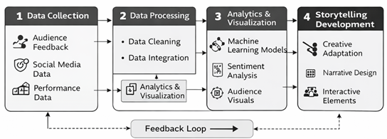 Storytelling in Performing Arts 3.4. Analytical Techniques and Tools To supplement the framework proposed, the investigation is grounded on the synthesis of analytical tools and digital tools that make it possible to transform crude information into creative outputs. This model employs machine learning to learn the engagement patterns and numerous other trends on what the audience would like to view in the form of narratives. The sentiment analysis techniques are used to analyze the audience reaction which is captured in the social media comment and feedback systems. Besides, it is possible to present the results of the analytical work in graphic form with the help of data visualization tools and provide them easily to artists and performance designers. The digital stage technologies are also present that comprise the multimedia projection systems, lighting control software and interactive media tools that take the analytical insights into artistic elements that are incorporated in the performance. All these tools contribute to the establishment of the atmosphere of cooperation among creative artistic efforts and information grounded in data to make the process of narrative disclosure more efficient. Alaguthankamani and Begum (2025) 3.5. Implementation Workflow The application of the suggested framework is organized to pursue a systematic workflow that links data collection, data analysis, and data output production. First, there are performance-related data and audience engagement data which are gathered through different sources. The data obtained is then subjected to analytical models to determine patterns and trends and emotional reactions. The creative teams such as the directors, the performers and the designers will interpret these insights and apply them to the storytelling elements. It is then applied to performances or digital art presentations using a modified storytelling structure. Lastly, the system measures the effectiveness of the data-driven storytelling methodology by assessing the level of audience engagement and feedbacks. This creative cycle guarantees that the creative side of art is constantly being harnessed with analytical information in order to provide performing arts experiences that are more interactive and responsive. 4. Applications and Results 4.1. Applications in Theatre Performances Data-driven storytelling in theatrical productions may affect a variety of performance service designs, such as script writing, character dynamics, and stage appearance. Feedback received by the audience via surveys and through the Internet will give information on the desired topics, speed of the narratives, and the emotional involvement to the characters. As an illustration, the sentiment analysis of the reactions of the audience may be used to determine the scenes that are likely to produce intense emotional responses. These can be used by directors and scriptwriters to improve delivery of dialogues, to change the pacing of the narrative or to focus on some themes in the story. Also, there are real-time interaction with the audience technologies, i.e., mobile voting, interactive stage, etc., where audiences typically have an impact on what happens on the narrative during the performance. An example of using data-driven storytelling in the theatre shows how analytical information can be used to complement storytelling that remains spontaneous and emotional, which define live performances. Jadhav et al. (2025) 4.2. Applications in Dance and Choreography Such data-oriented methods as motion capture systems and performance analytics are beneficial to dance performances. Wearable sensors and motion sensors may capture movement of dancers and give information in detail on posture, time, and space patterns. Through such data, choreographers are able to perfect the dance sequences, enhance coordination among the dancers as well as experiment with new movement patterns. As an example, the analysis of data can indicate the areas in which the transitions of the movements can become more fluid or where the visual effects can be improved with the help of the spatial positioning. Moreover, interactive dance work may also use real-time data streams, including movement of the audience or environmental information, to change the choreography in real-time. This kind of performances provides a special and integrative experience where by, the choreography moves and develops as the audience participates and in a context. 4.3. Applications in Music and Live Performances Storytelling using data has also been extensively used in music performances and live concerts. Composers and musicians can also study the behavior of the audience listening to the online platforms and determine the popular musical styles, tempos, and themes. Live performances can be captured with sensors and digital interaction platforms during performances, to detect reactions of the audience like the power of applause, movement behavior, or interactions via the mobile platform. It is possible to adjust musical orchestrations, light effects and visuals of the stage in real time using these data inputs. 4.4. Interactive and Immersive Storytelling Experiences Among the key benefits of the data-driven storytelling approach, there is the fact that it can be applied to facilitate interactive and immersive performance experiences. Data-driven systems allow the audience to be actively involved in the creation of the narrative as opposed to the traditional performance, where the audience is limited to a passive role. Real-time data of mobile devices, sensors or social media platforms are frequently used in interactive theatre productions, immersive dance performances or multimedia installations to affect narrative development. To illustrate, the decisions of producers made by the audience via mobile apps can shape the development of a narrative or the behavior of actors. These interactive narrative experiences develop a participative 