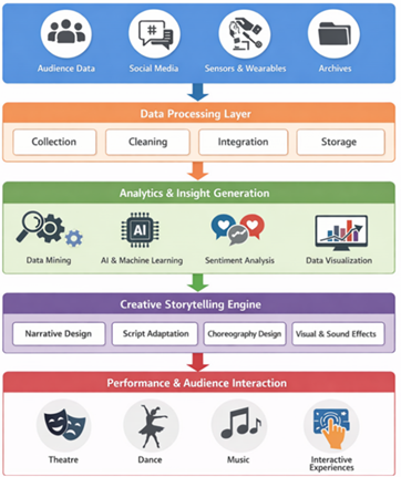 1. INTRODUCTION 1.1. Background of Data-Driven Storytelling Therefore, the background of Data-Driven Storytelling is the focus of the 1.1 section. Storytelling has been the main elements of performing arts, being a significant tool of conveying ideas, feelings, and cultural stories by artists to the audience. Conventionally, theatrical, dance, music, and other performing art storytelling has been based on human creativity, intuition, and experience. Nonetheless, as digital technologies have rapidly evolved, the creative process has started to incorporate computational technologies, data analytics, and artificial intelligence to improve art. Data-driven storytelling is a new paradigm in which high amounts of data are processed and become meaningful stories that have the potential to impact performance design, audience engagement, and creative decision-making. AlMousa et al. (2017). Over the last years, the growing access to digital information produced as a result of interaction with the audience, the use of social media, and performance analysis has provided new opportunities to the artists and researchers. Data-driven storytelling enables artists and actors to include the audience feedback, behavioral analytics, and real-time data into the structure of the narrative of the performance. This change is part of a larger movement that is sweeping the creative industry in which data analytics are utilized to inform innovation, audience optimization, and evidence-based creative practices. Ambros-Antemate et al. (2023). Data analytics integration into working with the arts do not eliminate human creativity but supports it. Now artists can utilize data to discover novel forms of narrating stories, discover what is popular with the audience, and develop immersive experiences that are better personalized and interactive. 1.2. Evolution of Technology in Performing Arts The application of technology in performing arts has been enhanced over the last century. The initial technological interventions were mainly the stage lighting, sound amplification and mechanical design of the stage, which promoted the visual and auditory effects of the performance. At the end of the twentieth century with the advent of digital technologies, performing arts started to include the multimedia aspects of digital projection, video installation, and computer generated soundscapes. Avola et al. (2019). The twenty-first century has brought an even more radical change upon the introduction of the latest computing technologies such as big data analytics, machine learning, and interactive online platforms. These technologies allow the performers and directors to examine the behavior of the audience, monitor the engagement patterns, and therefore adjust the performance. As an example, the valuable data can be gathered with the help of digital sensors, wearable devices, and audience interaction platforms during the performances, which will provide the insights into the audience reactions and emotional involvement. 1.3. Concept of Data Analytics in Creative Practices Data analytics can be defined as the methodical procedure of gathering, building, and analyzing information to draw valuable implications and make decisions. Within the framework of creative practices, data analytics can be applied to learn the audience behavior, assess the performance effectiveness, and contribute to the creation of new storytelling approaches. In performing arts, there are a number of ways that data analytics can be put into practice. The data on the audience gathered in ticketing, social media interactions and the digital platforms can give the audience patterns in terms of their demographics, preferences and their level of engagement. Motion capture technologies, stage sensors, and audiovisual systems can be used to generate performance data that can be very detailed in regards to the movement, timing and coordination of performers. Through such datasets, the artist and researchers will be able to get a better understanding of the role played by various aspects of a performance to the general audience experience Baker et al. (2017), Beristain-Colorado et al. (2021). Experimentation and innovation in the creative processes are also supported using data analytics. An analytical tool can be employed by the artists to experiment with various narrative and visual compositions and performance forms before offering them to the audiences. This methodology allows a more creative and reflexive process involving the artistic decision-making process that is backed by both empirical evidence and artistic intuition. Data analytics, therefore, can be very instrumental in closing the gap existing between artistic creativity and technological innovation. 1.4. Importance of Integrating Creativity and Data Creativity and the use of data are a major turn of the conceptualization, production, and evaluation of artistic performances. Artistic creativity has traditionally been considered to be an intuitive and subjective undertaking which is characterized mainly by the experience and imagination of the artist. Nonetheless, the accessibility of data is now growing, which has brought new opportunities to enhance creativity with the help of analytical knowledge. Chan (2018). Offering the unbiased information and creativity, the artist will be able to prepare a more engaging and powerful performance. The findings of data analysis may be used to determine the tendency in the audiences preferences and, in such a way, the performers are able to adjust the storylines, their themes, and styles of presentation to the needs of the audience and achieve a more favorable outcome in the form of the performance. The results of data analysis can be used to estimate the tendencies in the preferences of the audience and, in this way, the performers can adjust the storylines, the themes, or even the style of the presentation to the expectations of the audience and can provide a more pos