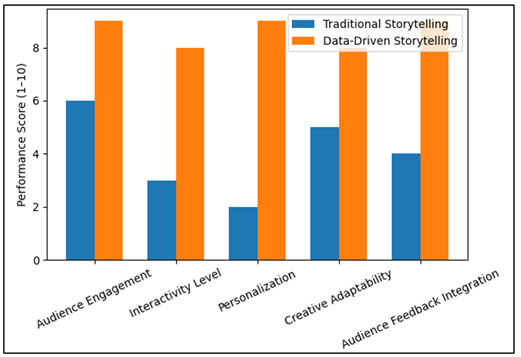 This will allow performances to be dynamically adapted and this will enhance the level of engagement and will also enable the audience to affect the narrative. Consequently, more scores are recorded in interactivity, personalization and integration of feedback 5.2. Graphical Representation of Comparative Analysis As the graphical representation in Figure 4 shows clearly, data-driven storytelling is superior in all the metrics taken into account in comparing it to the traditional one. The most significant differences are noticed regarding personalization, the degree of interactivity, and the incorporation of the audience feedback, which suggests the high significance of analytics and digital technologies to enhance the participatory storytelling. Formal narratives possess the advantages of creative plausibility and narrative functionality and the elasticity and receptiveness of information-based frameworks. The results show that the implementation of data analytics in the efforts of performing arts can help increase the viewer engagement by a significant margin and offer a more entertaining story. Veeravalli et al. (2025)-Banerjee and Hazarika (2014) 5.3. Discussion of Comparative Results The comparison and contrast analysis demonstrate that the element of using data in narration of a story is a paradigm change when it comes to performing. Audience data, interactive technologies, and analysis assist the performers in designing performances, which vary with the interaction. Still, the traditional narration is not unimportant in the respect of the preservation of the originality of art, emotionality and cultural identity. Consequently, the most appropriate solution is possibly a hybrid one, i.e. use of data-driven insights to supplement the traditional narrative techniques. This combination can help the performers to maintain the artistic value of telling stories and take pleasure in critical abilities of contemporary technology. 6. Conclusion The fusion of information and application of musical stories is a game changer to the performing art market. This paper dealt with the concept of data-driven storytelling in performing arts by highlighting the way the application of analytical tools, audience data, and digital technologies can enhance the creative performance, audience response, and performance adaptability. The creative analytics relationship has been examined in the paper based on systematic framework involving data collection, data analysis, creative combining action and performance. With the combination of the artistic perception and the empirical learning, one can possibly make the performing arts practitioners develop the responsive and the immersive experiences, which conform to the demands of the contemporary audience. This paper demonstrates that the use of data-driven narratives can have an enormous influence on the audience, personalization, and interactivity than other traditional storytelling methods. Under the comparative analysis carried out in this paper, data-grounded strategies were observed to enable the performers and the directors to be more knowledgeable of tastes of the audience, behavioral tendency, and emotional response. This fact may be used in tailoring stories, altering the element of the stage and introducing the interactive technology which creates more significant and interactive experiences. It can also be implied by the findings that the systems that are founded on analytics, allow creators to participate in informed decisions within production and the live performance stage, thus enhancing the overall quality and relevance of the artistic production. One of the most important contributions that have been made by the suggested conceptual framework is as the result of this research. The paradigm demonstrates how artistic processes can be systematically implemented in data collection tools, data analysis algorithms and innovative design processes. The proposed systematic architecture and critical analysis can establish a foundation of the research among scholars and practitioners who want to apply data science techniques to creative domains. In addition, it is also possible to note some practical applications of the study such as interactive theatre, adaptive stage performance, analysis of the audience feedback and personal narrative experience. This work can be further expanded in the future by undertaking empirical case studies and actual experimental applications onto the stage in case of theatrical productions, dances, and digital stages. One more way that researchers can consider to expand the experience of interactive storytelling is through the incorporation of Artificial Intelligence, machine learning, and immersive features like augmented and virtual reality. Besides that, cross-functional partnerships with data scientists, artists, and media technologists will be necessary to create new tools that do not lean too much on either aesthetic or analytical accuracy.