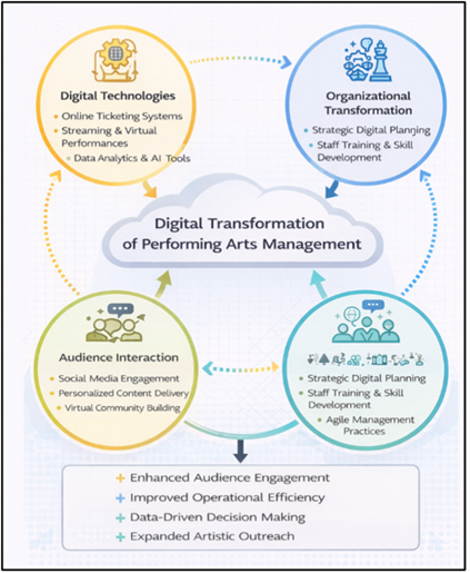 Collectively Drive the Digital Transformation of Performing Arts Management. 1.2. Impact of Digital Transformation on Creative Industries The overall creative and cultural sectors, film, music, theatre, and dance included, have greatly transformed due to digital transformation. Performances are now available in real time and in digital archives and social media venues allowing artists and organizations to present performances to audiences around geographic boundaries. The adoption of digital in performing arts in India and various other nations has been increasing at a high rate; it has been found that a significant percentage of cultural performances have found their way into digital medium through which they are promoted and distributed. The growth of streaming technologies and social media has been another reason of a significant rise in online attendance and international attendance on the performance arts events Brockinton et al. (2022). 1.3. Role of Technology in Performing Arts Organizations Technological innovations are becoming more significant in enhancing the operational and creative factor of performing arts organizations. It has made the process of purchasing a ticket easier as a result of digital ticketing systems, mobile apps, and contactless entry technologies that have made the process more enjoyable and have improved overall experiences of the audience. Now, the audience is able to purchase tickets, choose the seats, and get real-time updates using mobile devices and do not have to use physical box-office transactions as much as before. Furthermore, AI, cloud computing, and immersive media are also being used to help companies to automatize their administrative work, streamline their marketing efforts and improve the design of production. These inventions enable the performing art managers to incorporate digital technology in stage creation, analytics of the audience and distribution of the performances. 1.4. Research Motivation and Problem Statement Even though the use of digital technologies is rapidly growing, there are still numerous performing art organizations that have not been able to adopt digital transformation initiatives to the full extent. The factors that tend to reduce the efficient implementation of digital systems in cultural institutions are financial limitations, inadequate technological infrastructure, and incompetence in digital skills Doi and Murata (2020). Moreover, arts organizations should reconcile the technological revolution and the maintenance of artistic authenticity and culture. With the changing demands of the audiences to be more interactive and engaging, performing arts managers have to deal with the issue of changing the conventional models of management to respond to the needs of digitally connected audiences. These issues point to the necessity of systematic framework that would help performing arts organisations to embrace digital technologies and preserve artistic integrity. 1.5. Research Questions This paper will deal with several research questions associated with the digitalization of performing arts management. To begin with, what are the effects of digital technologies on management of performing arts organizations? Second, which strategies are taken to improve the engagement of the audience and operational efficiency using digital platforms? Third, what are the challenges and barriers that performing arts managers encounter when they have to implement a digital transformation initiative? Lastly, what would be the technology changes that are expected to influence the management and sustainability of performing arts organisations in the digital age? 1.6. Structure of the Paper The rest of the paper is structured in the following way. Section 2 provides a review of literature to date on digital transformation in creative industries and performing arts management. Section 3 addresses some of the most significant digital transformation strategies implemented by performing art organizations. Section 4 provides a theoretical framework of digital revolution in performing arts management. Section 5 will examine applicability and examples of how digital technologies have been used in the arts organizations. Section 6 looks at the key challenges and obstacles that are linked to digital transformation. Section 7 gives future developments of incorporating the emerging technologies in performing arts management. Lastly, the study ends with a conclusion where the main findings are summarized and research and practitioner recommendations provided to the performing arts industry. 2. Literature Review 2.1. Evolution of Performing Arts Management The management of performing arts has developed considerably during the last several decades, changing the outdated administrative principle to the more professional and strategic management styles. Traditionally, performing arts organizations used manual systems as the main approach to ticketing, promoting and engaging the audience. Management practices were directed more towards artistic programmes, venue management, and reaching the local audience. Nevertheless, as the cultural industries in the world have become global and as digital media continue to grow, strategic planning, marketing management and audience relationship management as core elements of performing arts management have, over time, been introduced to the performing arts management field. However, this development has increased over the recent years with the advent of technologies, which allowed organizations to embrace digital platforms to promote performances, sell tickets, and engage the audience. Ebert et al. (2023). The digitalization of various tools has enabled the performing arts organizations to work more effectively, reach even more audiences, as well as experiment with new modes of artistic representation. 2.2. Digital Transformation in Cultural and Creative Industries Digital transformation is a key trend in the process of