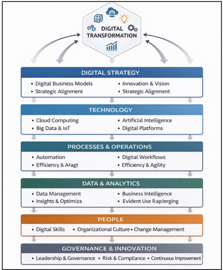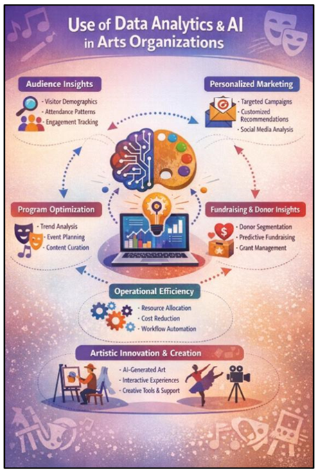 Figure 2 Application of Data Analytics and Artificial Intelligence in Arts Organizations The Figure 2 shows that Data Analytics and Artificial Intelligence (AI) assist the arts organization operations and decision-making processes. AI-based systems are used to analyze the audience data, attendance trends, and metrics of the engagement to create audience insights and provide the opportunity to implement the personalized marketing strategies. Data analytics would also be useful in the optimization of the programs, as it allows organizations to design events and curate content based on the preferences and trends of the audience. Also, AI can be used to accelerate operational processes, optimize resources, and automate them to improve their efficiency, as well as promote artistic innovation using AI-enabled creative aids and interactive art experiences. 2.5. Existing Digital Transformation Frameworks A large number of models stress the importance of the strategic alignment between technology competencies and organizational objectives as a guarantee of the success of digital transformation. Moreover, studies indicate that an effective digital transformation must be well supported by a robust leadership, investment in digital infrastructure, and sustained education of the staff to attain digital skills. These models offer good advice to performing arts organizations that are planning to incorporate the use of digital technologies in their management Li et al. (2022). Figure 3
