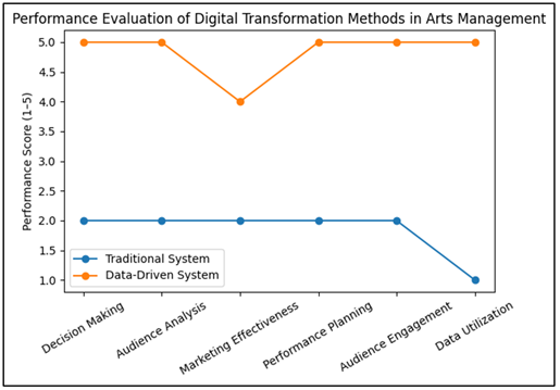 Figure 5 Performance Evaluation of Traditional and Data-Driven Digital Transformation Methods in Performing Arts Management Across Key Operational Parameters The plot presented in Figure 5 provides a comparison of the performance of the traditional performing arts management system and the suggested data-driven digital transformation strategy that involves the comparison of the performance in terms of six major parameters: decision making, analysis of the audience, marketing effectiveness, performance planning, engagement with the audience, and data utilization. The scores of performance represent a scale between 1 (poor performance) and 5 (good performance). Rawandale and Kolte, (2021) The findings indicate that the data-driven system has a high performance score on all parameters. Specifically, important changes are also observed in the analysis of the audience, its planning, its involvement, and the use of data, where digital solutions, including analytics and machine learning, can offer more information and predictability. On the contrary, the traditional systems present lower scores because of adherence to manual processes, minimal sources of data, and experience-based decision-making. Venkata et al. (2025)-Hazarika et al. (2024) 7. Challenges and Limitations lthough digital transformation offers many opportunities to the management of performing arts, there are numerous challenges and limitations that need to be considered to achieve success in its implementation process. The initial challenge is the high price of technological infrastructure needed to support digital platforms, the use of cloud storage, and advanced analytics tools. A significant number of small and medium performing arts organizations do not have many financial resources and it is challenging to invest in advanced digital technologies. The other challenge is technical skills and digital skills. The deployment of data-driven management systems will involve having personnel who have the skills in data analytics, machine learning, and digital marketing. Nevertheless, most performing arts institutions are more oriented towards artistic processes and do not necessarily have technical specialists who could administer complicated digital systems. Privacy and security of data are also concerns in digital transformation projects. The nature of performing arts organizations is that they gather large volumes of audience data via the ticketing systems, online platforms and social media. The storage and ethical use of such data should be ensured so that the audience can trust it and the laws of data protection are not violated. Moreover, the organizational resistance to change during the adoption of digital technologies can be present. Traditional working methods have been used by artists, administrators, and staff members who might be reluctant to employ new digital systems. Effective digital transformation is thus associated with training in the organization, executive support, and implementation plans. Lastly, digital technologies do not need to harm the artistic integrity and creative freedom of the productions of the performing arts. Although a managerial decision may be informed by data, artistic creativity cannot be left out when developing a performance. 8. Future Research Directions The introduction of digital technologies into the sphere of performing arts management introduces some prospects into the aspect of research in the future. A potential opportunity is the use of artificial intelligence and machine learning to study the behavior of the audience and create individual artistic experiences. The recommendation systems based on AI may recommend performances to the audiences depending on their preferences, just like the recommendation systems applied to the digital entertainment platforms. The other possible research field is the creation of immersive performing arts experiences with the help of augmented reality (AR) and virtual reality (VR) technologies. These technologies have the ability to create interactive spaces in which audiences can engage in performances where they are not present or be seen or feel greater visual aspects in live productions. The future research can as well involve the use of blockchain technology in the arts management especially with regard to ticketing systems and digital rights management. Online ticketing systems based on blockchain have the potential to decrease fraud, enhance transparency, and facilitate the distribution of digital content of performance. Besides, more studies can be carried out about the incorporation of Internet of Things (IoT) technologies in performance venues. Smart gadgets and sensors would be able to gather real-time information on audience movement, engagement and environmental factors which would be of use in managing venues effectively and enhancing the audience experience. Lastly, arts management studies, data science, and digital media can be used in interdisciplinary investigation to create new models of digital performing arts ecosystems. 9. Conclusion The blistering development of the digital technologies has had a great impact on the changing of the performing arts management landscape. Conventionally, performing arts organizations used manual operations, subjective decision making and the limited audience outreach system. Nonetheless, the advent of the modern technologies like data analytics, artificial intelligence, digital platforms, and interactivity media has introduced the performing arts to a new era where efficiency, inclusivity, and data-based decision-making are considered to be the best practices. This paper discussed the notion of Data-Driven Performing Arts Management and suggested an entire framework of embedding the concept of digital transformation into the performing arts ecosystem. The new system architecture is focused on the coordination of several technological elements such as data gathering systems, data processing systems,