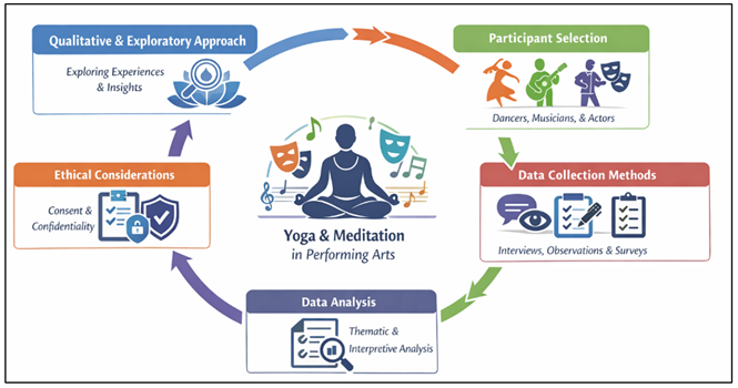 Figure 1 Proposed Methodology The research methodology framework applied in the research is shown in Figure 1 above. It starts out with a qualitative, exploratory research design which aims at comprehending the experiences of performers with yoga and meditation in performance practice. The participants will be chosen among dance, music, and theatre fields, including performers, students, and instructors. The information is obtained by interviews, observations, and surveys and analyzed with the help of the thematic analysis to find patterns associated with creativity, presence, and well-being. The framework further takes into consideration the ethical aspects, such as informed consent, confidentiality and voluntary involvement in order to conduct responsible research. Karule et al. (2025) 4.5. Ethical Considerations The methodology of the research involves ethical issues. The individuals to be involved in the study are informed of the purpose and aims of the study before getting interviewed or conducting surveys. Participation will be voluntary and no-one will be subjected to any adverse repercussions should he/she decide to withdraw out of the study. All participants are informed of their participation in the process and thus, informed consent is given so that their rights are respected. Besides, the personal details of the participants and answers are secured and only used to gather research. The foundations of anonymity are upheld in the publication of the results to safeguard the participants. These ethical provisions will make the course of the research responsible without infringing the dignity and privacy of all the people in the study. 5. Yoga and Meditation in Performance Training 5.1. Breath Control and Pranayama for Performers The control of breath is an important element of performance training because it has a direct impact on physical endurance, voice quality, emotional range and cognitive concentration. Pranayama or the breathing yoga enables the performers to learn the methods of controlling their breath cycles and making them more effective in breathing. Controlled breathing is used in the performing arts of music, theatre, and dance to provide an element of rhythmic stability, clarity in the voice and continuation of physical movement. Deep breathing, alternate nostril breathing, and breathing exercises that are done rhythmically are pranayama practices that can assist performers to relax their nervous systems, and eliminate anxiety during pre-performance moments. These activities will also enhance the oxygenation of the brain and muscles which will aid in the concentration, energy equilibrium, and the overall quality of the performance. Vasanthan and Nandhini (2022) 5.2. Asana Practice for Physical Alignment and Balance There are yoga postures called asanas, which have a lot of contribution in the physical conditioning of performers. Performing artists need a strong, flexible, posture-correct, and body-control so that they can make movements correctly and safely. Stretching and strengthening exercises using yoga contribute to increasing muscular balance, joint mobility, and body awareness. Asanas increase flexibility and coordination which are necessary in the work of dancers and actors as they perform physically demanding shows. Yoga postures also help to maintain the correct position of the spine and muscle stability which decreases the chances of repetitive movements or muscle fatigue which can lead to injury. Conscious movement and talented control of the posture help performers to get closer to their body, which enables them to move more accurately and expressively. Asanas can also enhance recovery and relaxation following the hard practices or shows, which allows the performers to have a healthy physical body in the long run. Rawandale et al. (2023) 5.3. Meditation for Stage Presence and Mental Focus The technique of meditation is an effective means of achieving clarity of mind, emotional regulation and stage presence. Performers also have to deal with a lot of pressure, a lot of performance anxiety, and distraction of the mind in performance settings. The meditations like mindfulness meditation, guided visualization and focused attention exercises enable the performers to develop calmness and mental stability. Meditation helps performers to be continually focused on the now moment so that they can be completely involved in their artistic expression and interrelations on stage. This increased awareness boosts the intuitiveness of the performer to music, movement and other performers in live performances. The emotional regulation enhanced by the meditation will also enable performers to use their emotions in a positive way in their artistic expression instead of being overcome by the stress or self-doubt. Consequently, meditation enhances confidence levels of performers on stage, and their presence. 5.4. Integrating Mindfulness into Rehearsal Processes It is possible to make the practice of mindfulness a part of the rehearsal process, which is likely to have a massive impact on the performance training. Mindful rehearsal helps performers to be more attentive and self-aware of their practice times and give those practices an opportunity to experiment. As an example, in the first rehearsals, it can be useful to start the process with short breathing exercises or guided meditation sessions that can bring the attention of the performers and allow them to prepare mentally to engage in creative work. The methods of mindfulness will also help the performers to notice their movements, emotions, and creative thoughts with less judgment. This non-judgmental understanding helps in creative investigation and the fear of committing errors that occur in rehearsals is minimized. Mindfulness in the performance environment can also enhance communication and coordination between performers in collaborative performance environments through promoting attentive listening and awareness 