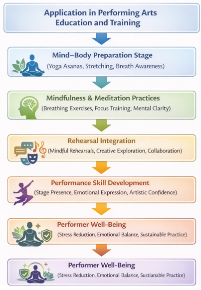 Training The Figure 2 demonstrates how yoga and meditation are used in the education and training of performing arts using a systematic approach. It starts with mind body preparation when yoga postures, stretching and breath awareness can train performers to create physical alignment and body control. This is then accompanied by mindfulness and meditation which increases focus, emotional intelligence and mental clarity. These methods are then incorporated into a rehearsal process which promotes mindful practice, exploration/ creativity, and learning in a group context. Therefore, through this process, performers enhance performance competencies, including stage presence skills, emotional expression, and artistic confidence. Finally, the framework facilitates the well-being of performers, such as reduction of stress, emotional stability, and sustainable artistic practice. 8. Challenges and Future Research Directions 8.1. Cultural and Pedagogical Barriers Although yoga and meditation are becoming increasingly popular in performance training, there are a number of cultural and pedagogical issues that could prevent their proliferation. In other performing arts organizations, the conventional training paradigm is to focus on mastery and intensity of rehearsal, with little time to engage in reflective or restorative practices. Consequently, yoga and meditation can be considered secondary and not key parts of performance education. Moreover, the cultural understanding of the mindfulness practices might not be uniform within the institutions and geography. Yoga has become popular in the world but its philosophical and holistic nature is not always taken seriously in contemporary academic settings. The solution to these obstacles is to make educators and institutions more aware of the possible advantages of incorporating mind-body practices into artistic training programs. 8.2. Accessibility and Training Limitations The availability of trained instructors and organization of training materials is another issue in applying yoga and meditation to the performance practice. Most institutions of performing art cannot afford skilled individuals to help performers in mindfulness-based practice. Performers may find it difficult to make such practices a habit or to effectively use them in their artistic practice without sufficient guidance. Moreover, lack of time during rigorous training programs can be a barrier to performing regular mindfulness training on the part of the performers. To respond to these constraints, the institutions might have to create interdisciplinary training programs that united performing arts training with wellness and mindfulness training. 8.3. Need for Empirical Validation Most of the existing studies are based on qualitative observations or a small sample size that could inhibit the extrapolation of their results. Further studies need to be directed towards controlled experiments, longitudinal studies, and interdisciplinary studies that look at the verifiable effect of mindfulness practices on performance outcomes. Quantitative measures of stress reduction, confidence in performance training, assessment of creativity, and audience involvement may prove to be useful in determining the impact of yoga and meditation on performance training. 8.4. Opportunities for Interdisciplinary Research The combination of yoga, meditation, and performance practice provide opportunities of interdisciplinary cooperation and collaboration in the sphere of performing arts, psychology, neuroscience, education, and the studies of wellness. The question of the impact of mindfulness practices on creativity, attention, and emotion regulation related to cognitive processes can be investigated by researchers. One can also look to technological progress in the fields of physiological monitoring, motion analysis, and neurocognitive assessment tools that might offer further ways in which mind-body practices and artistic performance can be examined in relation to each other. Also, the role of traditional contemplative practices regarding the expression of art in various cultural settings can be explored through cross-cultural studies. These interdisciplinary studies can further enhance our knowledge about the use of mindfulness in creative practice and can be used to introduce new training methods to performers in the future. 9. Conclusion In this paper, the author will discuss the application of yoga and meditation to enhance creativity, being a performer, and general well-being of performing artists. As performing arts involve a complex integration of physical agility, emotionally investing, and cognitive focus, the establishment of mind-body practices is an implementation of a systematic plan of executing training and performance development. The research illustrates the essence of the conventional techniques such as yoga postures, breathing regulation and meditation to assist the performers to become increasingly conscious physically, mentally and emotionally stable. All these contribute to the improved expressive art and performance viability. This is demonstrated in the literature review which indicates that yoga and meditation have increasingly become established as a viable application in training of creative arts. These methods make artists more flexible, in a good posture, able to control breath and the concentration which are the major components of a successful performance. In addition, performers can engage in mindfulness-based practices to cope with performance anxiety, stress, and the ability to cope with challenging artistic environments. Cultivation of the sense of the present moment and non-judgmental observation help the performers to be more involved into their creative practices and be more natural in their reactions during live shows. The other study recommendation is the Mindfulness-Based Performance Framework which assumes that yoga and breath-control, meditation and creative performa