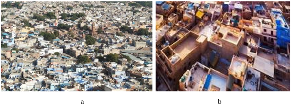 In Jodhpur's historic inner core, a protected hamlet enclosed by a 10 KM barrier and eight entrances known as pol, the outward-facing roads surrounding the marketplace are typically 20 feet wide, occasionally expanding to 30 feet. Within the residential neighborhoods, the interior streets vary in width from 6 to 8 feet, occasionally reaching 10 feet and even narrowing to 5 feet in certain areas. The distinctive blue hue of the homes, attributed to layers of limestone, copper sulfate, and indigo, serves to maintain cool temperatures during the hot months. Intriguingly, this color, rich with religious significance, has been historically associated with the Brahmin community. The narrow lanes of the neighborhood, such as Brahmpuri for Brahmins, Sunaron Ki Ghati for goldsmiths, and Bohron Ki Pol for financiers, are organized based on social strata and ownership, reflecting the unique fabric of Jodhpur's social and cultural landscape. Gajjar & Bhavsar (2019) 2.1. NARROW STREET AND ORIENTATION The narrow alleyways with towering walls in certain areas cast shadows on the streets, effectively cooling them down. These dense streets, as depicted in Figure 2b, are strategically oriented east- west to minimize the transmission of solar radiation, as illustrated in the sectional view in Figure 2a. This arrangement also creates an irregular layout where the wind can be redirected, aiding in controlling sandstorms and enhancing comfort for residents. The layout of the complete cluster shows orientation and movement as visible in Figure 4a. Figure 2