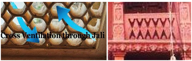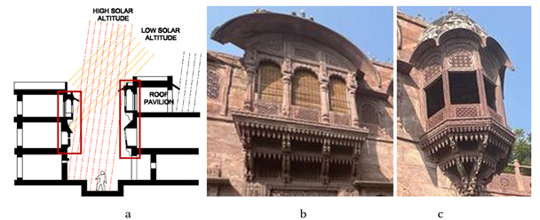 5.1. JHAROKHAS Jharokhas, a distinctive architectural feature of the region, offer excellent shading capabilities as depicted in Figure 13b. Positioned on the southern edge, these windows effectively block the harsh east-west sunlight, exemplified in Figure 13c. Typically crafted from sandstone, Jharokhas are ornamental projections from Havelis, resembling intricately carved boxes, with dimensions typically measuring 3' by 6'. They feature a passage and a sandstone floor topped by an arched canopy, casting a shadowy ambiance onto the street below. Gallo (1994), Afreen et al. (2018) An architectural element protruding around the aperture not only enhances privacy and aesthetics but also offers glimpses of the street view. During summer, it aids in filtering sand-laden breezes while regulating airflow and cooling internal spaces. Conversely, when sunlight penetrates during the day, diffused light permeates the interiors. For optimal outside views, cutouts are strategically placed at eye level, catering to viewers seated indoors Kumari et al. (2020). 5.2. SMALL WINDOW A compact window on a large wall, in vernacular constructions of desert, enables the airflow to move into the structure with more strength. When high-velocity winds enter a larger area, they disperse rapidly, effectively regulating interior temperatures. Employing such rudimentary construction techniques, like a wind tower, inner courtyards with latticed screens, and small openings, proves instrumental in blocking sunlight and optimizing air circulation. 5.3. JAALI (SCREENS) In this climate, these architectural features play a vital role and are widely employed. They offer seclusion, regulate ventilation, and effectively lower indoor temperatures. Even in bright daylight, these spaces maintain privacy from the outside while allowing dispersed light to illuminate the interiors, as depicted in Figure 14a. Additionally, cut-outs at eye level, illustrated in Figure 14b and Figure 14c, enable observers seated on the floor to enjoy clear external views. Jaalis, or latticed screens, further enhance airflow through their slits, facilitating natural air circulation. Notably, they offer women the opportunity to enjoy panoramic vistas without compromising their privacy. Figure 14