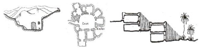 6.2. RURAL HOUSE WALL To regulate heat and repel insects, indigenous huts often receive an exterior coating of cow manure. Additionally, widening the walls to 45cm helps delay heat exchange between the outer and inner environments. Sandstone emerges as the optimal material for this purpose due to its effectiveness and cost-efficiency. The construction method involves layering stones atop one another, creating what is known as dry stone structures or arranged stone walls, devoid of cement or mortar Goussous et al. (2023). These layer stone walls are meticulously assembled, with carefully selected stones interlocking to provide strength and stability. The weight and interlocking design of the stones impart rigidity, enabling the wall to withstand lateral forces such as earthquakes and winds. Moreover, since mortar joints don't degrade over time, layer stone walls require minimal upkeep, offering long-term durability and structural integrity. 6.3. CULTURAL HABITS AND TRADITION In Jodhpur, where the streets are inherently public spaces, privacy is achieved at the household level, with the boundary serving as delineation between formal and informal areas. This social structure not only seeks seclusion from bustling thoroughfares but also plays a crucial role in enhancing energy efficiency Sharma et al. (2018). The layout and orientation of homes further contribute to privacy, with courtyards serving as central hubs for illumination and ventilation, evolving their own vernacular expressions suited to the locality and era. The city offers numerous opportunities for users to engage with architectural design, evident in the transformation of roads into open spaces that integrate seamlessly with local lifestyles. These communal spaces, initially conceived to mitigate the harsh summer sun, continue to serve as gathering points, fostering a sense of community despite evolving family structures. However, their integrity has suffered over time, leading to a decline in communal spirit and a sense of ownership, impacting the city as a whole. Elevated plinths demarcating formal and informal zones act as porticoes for individual buildings, a stratification evident even in walkways where storefronts feature higher plinths to shield customers from adverse weather and cool the interiors Patil (2015), Sridharan et al. (2019). These Chabutras, or elevated platforms, serve as sanctuaries and transitional spaces between social and economic spheres. However, they have been largely overlooked in the design and development of new commercial districts or streetscapes, resulting in abrupt building transitions and a lack of cohesive urban planning. 7. ANALYSIS WITH REGIONS FACING IDENTICAL CLIMATIC PLIGHT Vernacular approaches to environmental adaptation in Jodhpur often parallel techniques found in regions with similar climatic conditions. For instance, vernacular air circulation methods used in hot, dry climates are prevalent in countries like Egypt, Iraq, Iran, and certain arid zones in Australia, such as Camooweal. The Malqaf, a 3300-year-old exterior air-capturing method employed in Egypt, shares similarities with the Badgir vernacular technology used in Iran and the United Arab Emirates. Malqaf principles have been integrated into modern designs, such as the Torrent Pharmaceutical Company's research center in Ahmedabad, India, and the Mining and Minerals Museum in Broken Hill, Australia, designed by Glenn Murcutt Sakr (2011) Similarly, wind catchers, employed by Hassan Fathy to enhance thermal comfort indoors in hot arid desert regions like ancient Cairo, are prevalent in Iran. These tall towers function as canals, guiding cool winds into constructions and ventilating rooms through the chimney effect. In Yazd architecture, wind catchers are used to create summertime spaces or cellars. Mahdy (2018) In Turkey, individuals have ingeniously utilized soft rock to excavate their dwellings, taking advantage of the ground's depths as a natural refrigerator for food storage. Similarly, in Matmata, Tunisia, the entire town is constructed underground to mitigate the region's unbearably hot arid climate and act as a thermal barrier. The terrain plays a crucial role in climate regulation for suburban living in Matmata, shielding residents from intense solar radiation and sand-laden winds. Additionally, leveraging the gradients of hills allows for the creation of shaded pathways, enhancing comfort and usability in outdoor spaces. These practices demonstrate the resourcefulness of vernacular architecture in adapting to and mitigating challenging environmental conditions as shown in Figure 17a and Figure 17b. Figure 17