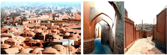 In Yazd's vernacular architecture, special attention is given to mitigating the heat and intense sunlight of summer. Buildings are designed with narrow, east-to-west oriented canals, enclosed by high adobe walls on each side Shoaie & Habib (2014). These channels optimize shadow formation, creating a barrier of cool air at ground level that prevents warm air from descending to the lowest parts of the houses. Additionally, some walkways are covered or vaulted, forming Sabats (roofed alleys) Figure 18b, to provide further shading coverage. The dense fabric of narrow sidewalks further contributes to shading in the region. Nubian Nomadic architecture is characterized by its decorative and inventive features. Mud brick walls, plastered with Kershef, are adorned with hieroglyphics, showcasing the artistic flair of the Nubian people. Nguyen et al. (2019) Courtyards with open windows provide passive cooling to the arid desert air, while arches and barrel vaults are used to deflect sunlight at certain angles instead of employing flat roofs Mahgoub (1990). Triangular apertures, known as pigeon holes, are positioned over each window opening to further control sunlight entry and ventilation. These architectural elements demonstrate the ingenuity and adaptability of Nubian architecture to the harsh desert environment.