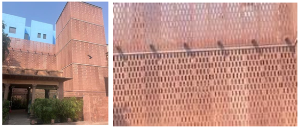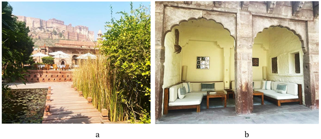 In the Raas Haveli Hotel project in Jodhpur, modern buildings constructed using the same materials and skills as traditional buildings are strategically integrated into the site to enhance the visual and spatial connection between historic structures and the Mehrangarh Fort. This approach fosters a dialogue between the old and the new Case Study on Raas Jodhpur Hotel, (2018). Vernacular elements such as old double-skinned structures, including the stone-latticed Jharokha, are utilized to define the site and create a sense of continuity with the surrounding architecture. The stone Jaali (lattice) partitions rose to allow visitors to open them for uninterrupted views of the fort or close them for privacy and protection from the sun, exemplify the incorporation of vernacular features into modern buildings with excellence. These elements not only pay homage to traditional architectural practices but also enhance the overall aesthetic and functionality of the space. Figure 20