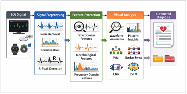 1. INTRODUCTION Cardiovascular diseases are a global health issue and claim thousands of millions of lives annually in both the developing and the developed countries. The timely diagnosis and the correct identification of cardiac abnormalities play a key role in ensuring the decrease of mortality rate and patient outcomes. Electrocardiography is widely used as a procedure in clinical practice because it is a non-invasive technique of monitoring the electrical activity of the heart. ECG signals prove useful in revealing a mandatory information on the heart rhythm, circuits of conduction and condition of the cardiac tissues Jandera et al. (2025). Despite its importance, it can be tedious and time consuming due to the morphological variation of the waveforms and noise or artifact of the signal to be interpreted manually in ECG recordings. These are some of the elements of the waveforms that medical practitioners put into consideration, such as P wave, QRS complex, and T wave of the existence of abnormal cardiac conditions analysis. The problem of uncertainty of variability of patients also contributes to the difficulty of proper interpretation Ayano et al. (2023), as well as variation in recording conditions. The latest advancements in the area of computational intelligence have allowed one to create the automated ECG analysis systems that can be used to assist clinicians in detecting cardiac abnormalities effectively. Machine learning has been found to be very useful in identifying patterns, classifying and predicting models and hence would be useful in the analysis of biomedical signals. These algorithms are capable of obtaining complex relationship in large amounts of data and locating small shifts in signals which may be challenging to locate in a otherwise manually analyzed process. At the same time, the visual analytics techniques can be applied to provide the intuitive visuals of the patterns of the signals that can guide the researchers and clinicians to understand how the deviations can be visible in the ECG waveforms Basco et al. (2025). The combination of machine learning with visual signal analysis offers a powerful automated system of cardiac diagnostics. Having high accuracy, such systems may be utilized in dealing with a lot of ECG data and derive meaningful information and discriminate between abnormal heart conditions. Another method of enhancing interpretability to allow clinicians to trace the existence of abnormal patterns and verify prediction of algorithms is visual analysis. The overall healthcare transformation is also contributed to by the development of intelligent ECG diagnostic frameworks that are developed based on data-driven technologies Attia et al. (2021). A series of automated analysis tools has a potential of supporting remote monitoring systems, wearable health devices and telemedicine platforms and enable the continuous monitoring of the cardiac conditions outside the traditional clinical environment. These technologies increase the accessibility to cardiac care and reduce the diagnostic load of health workers. Machine learning-based ECG analysis research is therefore a significant step to a more efficient and scalable healthcare system. 2. Background and Related Work Changes in these components of the waveforms may be a sign of various cardiac abnormalities like arrhythmias, myocardial infarction, or conduction disorders. In conventional versions of ECG analysis, rule-based algorithms and signal processing techniques are mostly used to identify abnormalities in the recorded signals Chong et al. (2025). The initial automated ECG analysis systems were devoted to the identification of the R-peaks and quantification of the time between the consecutive heartbeats. Algorithms based on signal filtering and peak detection were common to detect the parts of a heartbeat and determine heart rate variability and QRS duration among other parameters. Although these methods yielded valuable information, they were generally restricted by the sensitivity of noise and the variability of the morphology of the waveform in different patients Denysyuk et al. (2023). The performance of automated ECG classification systems has been enhanced by machine learning methods to a great extent. The Support Vector Machines, k-Nearest Neighbor classifier and the random forest models are just some of the algorithms that have been extensively used in the classification of ECG signal. The techniques utilize features obtained off the ECG signals in order to train patterns linked to normal and abnormal cardiac conditions. The commonly used features extraction methods involve the time-domain statistics, frequency-domain features, and the morphological features of the ECG waveforms Goettling et al. (2024). The ECG signal analysis has also been developed through deep learning techniques. Convolutional Neural Networks have also shown high potential in automatically learning emergent hierarchical features directly out of raw ECGs. Recurrent neural networks and Long Short-Term Memory models have been also used to represent temporal correlations in sequential cardiac signals Pande et al. (2024). With these models, arrhythmias and other heart diseases can be detected with high levels of precision automatically. The recent research has also been conducted into visual analytics in ECG signal interpretation. Visual representation (spectrograms, heatmaps, and waveform plots) helps the researcher to visualize the alterations in the signal and abnormal trends better. The visual examination of the heart optical properties and machine learning algorithms have a positive effect on the readability of the process and the improved understanding of how the classification algorithms are applied to identify an abnormal heart activity He et al. (2025). Amidst many automated ECG classification systems, challenges remain to be obtained in order to attain reliable results when using a large number of patients and rec