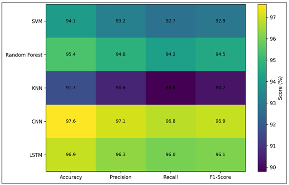 Figure 4 Heatmap Representation of Model Evaluation Metrics The other factor of assessing machine learning models also relates to the trade off between the accuracy of the classification and the cost of computing them. Although deep learning models generally offer more accuracy in detection, the models have extended training durations since they are more complex in nature. Figure 5 represents the relationship between training time and the accuracy of classification wherein each point indicates a certain model in the study experiment. According to the scatter plot, CNN and LSTM models are the ones that have the highest level of accuracy, but they also consume more resources at the training stage. Random Forests and SVM models represent a positive tradeoff between the performance of training and the classification accuracy, and thus are appropriate in systems with limited computational resources. Figure 5