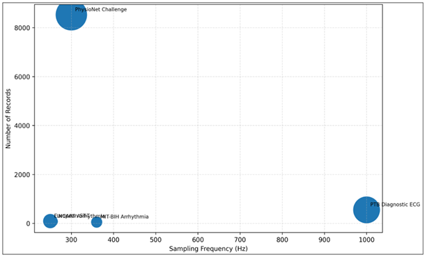 Figure 5 Accuracy–Efficiency Trade off Among Classification Models The ECG analysis systems are also evaluated based on the variety and quality of the datasets on which the model is trained and evaluated. The variability of the different datasets can be in terms of signal sampling frequency, number of recorded patients and duration of recorded signals. These properties determine the extent of generalization of trained models to clinical settings in the real world. The distribution of the dataset used in the study is shown in Figure 4 which is a bubble chart that explains the correlation between the sampling frequency and the quantity of the records in the popular ECG datasets. The bigger bubbles denote bigger datasets including more patient recordings, which mean that machine learning algorithms have more training data. The graphical representation demonstrates that big data like the PhysioNet challenge dataset offer a large amount of data on which to train powerful classification models. Figure 6