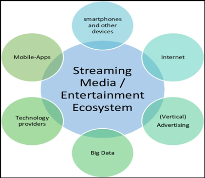 Figure 1 Framework Diagram for Digital Ecosystem of Performing Arts The Figure 1 represents the Streaming Media and Entertainment Ecosystem, highlighting the key technological components that support digital content distribution. Elements such as smartphones and other devices, the internet, mobile apps, technology providers, big data, and advertising work together to enable seamless streaming services. These interconnected components facilitate the creation, delivery, and monetization of digital entertainment content. In the context of performing arts, this ecosystem allows artists and organizations to distribute performances globally through digital platforms. 3.1. Platforms such as YouTube, Streaming Services, and Social Media The emergence of digital platforms has significantly transformed the performing arts industry by providing new channels for distribution, promotion, and audience interaction. Platforms such as YouTube, streaming services, and social media networks have enabled artists, performers, and cultural organizations to share their work with global audiences without the limitations of physical venues. These platforms have democratized the performing arts sector by allowing independent artists and smaller cultural groups to gain visibility alongside established institutions. Vasanthan, and Nandhini (2022) YouTube has become one of the most widely used platforms for sharing performing arts content. Musicians, dancers, theatre groups, and performance artists can upload recordings of their performances, rehearsals, and behind-the-scenes content. This accessibility enables artists to build a global fan base and reach audiences who may not have the opportunity to attend live performances. Additionally, YouTube allows artists to monetize their content through advertisements, memberships, and sponsorships, thereby creating alternative revenue streams. Streaming services have also contributed to the digital transformation of performing arts. Many cultural institutions and performing arts organizations now broadcast live performances through dedicated streaming platforms. Concerts, theatrical productions, and dance performances are often streamed live or made available on-demand, allowing audiences to watch performances from any location. These services enhance accessibility and enable cultural institutions to maintain audience engagement even when in-person attendance is limited. pSocial media platforms play a crucial role in promoting performing arts and fostering interaction between artists and audiences. Platforms such as Instagram, Facebook, and TikTok allow performers to share short clips, promotional content, rehearsal footage, and live sessions. Social media also encourages audience participation through comments, shares, and interactive features. As a result, these platforms have become powerful tools for marketing, audience development, and community building within the performing arts ecosystem. Garg et al. (2025) 3.2. Virtual Concerts, Online Theatre, and Digital Dance Performances The integration of digital technologies has led to the development of new formats of performing arts such as virtual concerts, online theatre productions, and digital dance performances. These formats allow artists to present performances in virtual environments while maintaining artistic creativity and audience engagement. Virtual concerts have become increasingly popular, particularly during global events such as the COVID-19 pandemic when physical gatherings were restricted. Artists began hosting live concerts through streaming platforms, enabling audiences to attend performances from their homes. Similarly, theatre companies started producing online theatre performances that could be streamed live or recorded for later viewing. Digital dance performances have also evolved through the use of multimedia technologies. Choreographers often incorporate digital projections, video editing, and virtual stage designs to enhance the visual experience. These performances combine traditional dance techniques with digital storytelling, creating innovative artistic expressions. To illustrate the various forms of digital performances, Table 2 presents different types of digital performing arts and their key characteristics. Table 2