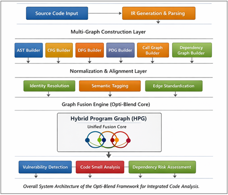 promotes interpretability and productivity of developers. 3.3. Hybrid Program Graph (HPG) Model The integrated representation that is obtained after the graph fusion is the Hybrid Program Graph. It incorporates nodes and edges of various types of graphs into a multi-typed directed graph. Nodes are structural (e.g. classes, functions), behavioral (e.g. execution blocks), and data (e.g. variables) entities. Edges retain relationships of control, data, call and dependency. The node and edge attributes are line numbers, risk scores, complexity values and external library metadata. As an example, the single traversal that is based on the control flow, data propagation, and dependency edges is used to identify a vulnerable API call. HPG therefore provides semantic support to built-in code intelligence. 3.4. Workflow of the Opti-Blend Framework Opti-Blend has a structured workflow of operation. The first stage is the processing of the source files in the form of intermediate representations. After this several graph structures are created concurrently. Entities across types of graph are standardized after construction through normalization and alignment. The fusion engine combines them into the Hybrid Program Graph. Pattern queries and calculation of metrics are performed by analytical modules. Lastly, the visualization interface displays the results in interactive overlaid results and traceable tracks. The modularity and flexibility are provided by this pipeline. Any of the stages can be optimized individually and scalability could be done through parallel processing. The workflow provides support of incremental updates, in such way that re-analysis can be done in case of changes in the source code without the need to reconstruct the entire graph. 3.5. Explainability Through Graph Traversal The ability to explain is one of the fundamental distinguishing features of the Opti-Blend framework. Once a possible problem is identified the system determines a flow in the Hybrid Program Graph between the root cause and the components that are affected. The traversal of a node is a semantically meaningful program entity. Visual overlays are used to denote the path of propagation, control branches and dependency chain involved in the issue. The developers can also follow the path of unvalidated input propagation through variables, a sensitive API call, and interaction with third-party libraries. The visual feedback loop saves a lot of time on debugging, and increases the confidence in the outputs of the analysis. 3.6. Scalability Considerations The use of repositories that are large needs effective storage and traversal policies. Opti-Blend uses methods of graph compression in order to remove redundancy without losing richness of the semantics. Storage mechanisms that are indexed allow rapid querying of nodes and edges that are more frequently used. Lazy loading is a method of ensuring that only the parts of the graph that are relevant are displayed so as to reduce the amount of memory used. Besides, the architecture is integrated with graph databases to store and traverse in a distributed way. These scalability factors render the framework appropriate to be implemented at an industrial level. 3.7. Advantages of the Proposed Architecture The Opti-Blend architecture is a last system that does not