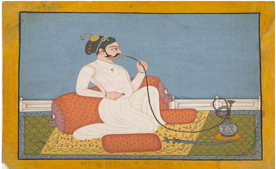 indicates his status. He reclines on a bulbous cushion and smokes an elaborate