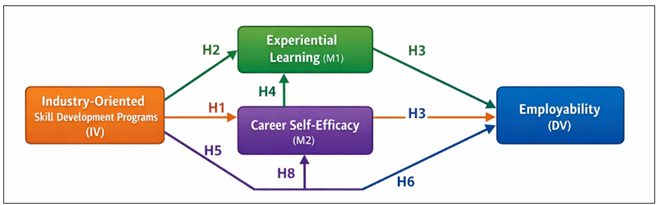 The three patterns in Table 1 are found in these studies. To begin with, employment-related skills and preparedness are always enhanced through industry-oriented and practical interventions like internships and simulations, as well as project-based learning. Second, self-efficacy emerges as a focal point, time and again, with respect to links between learning experience and more robust career outcomes. Third, the best evidence of your suggested framework relates to the papers displaying mediation pathways particularly those ones connecting training or support to employability, via self-efficacy. In your paper, this will support a model whereby industry-oriented skill development program enhances employability either directly or indirectly using experience learning and career self-efficacy. 3. Conceptual Framework and Hypotheses Development This section will provide the conceptual background and relationships of the study in theory. It combines approaches of the employability theory, the experiential learning theory, and the social cognitive theory to demonstrate the impact of industry-focused programs of developing skills on the employability of management students in which the mediating approach operates through experiential learning and career self-efficacy. 3.1. Theoretical Foundation The theoretical framework behind the conceptual model of this research includes three essential theoretical approaches: First, the Human Capital Theory that assumes the productivity and employability of an individual to increase as a result of investment in education and skills development. Skill development programs that focus on practical and market relevant skills through industry oriented programs, are a source of human capital improvement. Through these programs, students are able to gain technical and soft skills which are appreciated by employers. Second, Experiential Learning Theory (Kolb, 1984) highlights that knowledge is generated as a result of experience transformation. This theory states that effective learning takes place in a process of concrete experience, reflective observation, abstract conceptualization and active experimentation. Industry-based programs like internships, live projects, and simulations give the students a chance to take part in this circle of learning experience and this way further expands their knowledge base and enhances the capacity to real-life application of their learning. Third, the Social Cognitive Theory (Bandura, 1986) brings out the issue of self-efficacy as a behaviour and performance influencer. Efficacy in career in specific is a perception that an individual has in their ability to complete tasks related to career. Highly self-efficous students are more prone to initiative, to continuing in the face of obstacles and are more successful in their career than less highly self-efficacy students. The self-efficacy of the industry exposure and learning activities are based on experiential learning activities that give the experience of mastery and feedback. A combination of these theories offers a holistic approach to explaining the effect of skill development programs on employability and so on in a direct and indirect way. 3.2. Relationship between Industry-Oriented Skill Development Programs and Employability Skill development programs are industry oriented and are meant to fill the gap between academic learning and industry requirements. The programs make students more employable by building a job-specific set of skills, enhancing professional skills, and becoming better aware of work expectations. Empirical research has always indicated that learners who undertake internships, certification programs and collaborations with industry have a greater employability level than those who only rely on classical learning in the classrooms. The hypothesis is, therefore, as follows: H1: Industry oriented skill development programs affect the employability of management students significantly and in a positive way. 3.3. Mediating Role of Experiential Learning As an essential process by which programmes on skills development affect employability, experiential learning plays a pivotal role. Industry-based programs help students to take part in practical activities and to reflect on their experience and to use theoretical knowledge in real life. The process also improves critical thinking, problem-solving skills and decision-making skills which are key elements of employability. In addition, experiential learning helps students gain a better grasp of industry practices, enhancing their preparedness to work. It also encourages active participation and motivation resulting in improved learning. Based on this, the hypotheses are as follows: H2: Experiential learning is positively influenced significantly by industry-oriented programs of skill development. H3: Experience learning has a large positive influence on employability. H4: Experiential learning will mediate the correlation that exists between industry-based skill development programs and employability. 3.4. Mediating Role of Career Self-Efficacy Another factor that is significant in determining employability is career self-efficacy. Industry based courses can give students experience to work on tasks, to get feedback and to master certain tasks. The experiences boost student confidence in their ability and thus their career self-efficacy. Increased career self-efficacy results in increased motivation, active career behavior and enhanced job performance. Individuals who have high self-efficacy tend to pursue difficult opportunities, they are also likely to succeed in interviews and fit well in the workplace. The hypothesis formulated is as follows based on this: H5: There is a positive impact of the industry-based skill development programs on career self-efficacy that is significant. H6: There is a positive significant impact of career self-efficacy on employability. H7: The mediator occurring between the industr