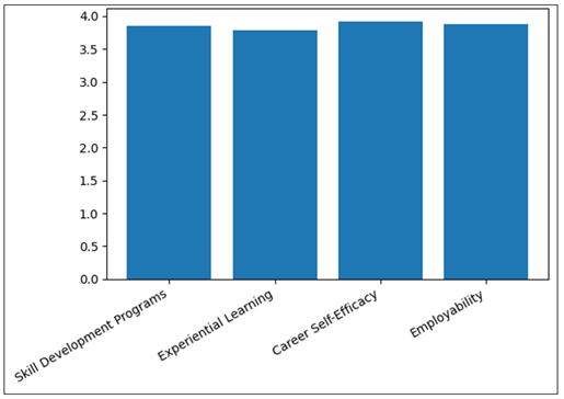 Table 2 indicates that the mean of all the constructs, which include the skill development program, experiential learning, career self-efficacy, and employability, are more than 3.7, which implies that students enjoy a positive attitude towards their skills and readiness to work. The median standard deviation indicates that there is a variation in the experience of students. Table 3