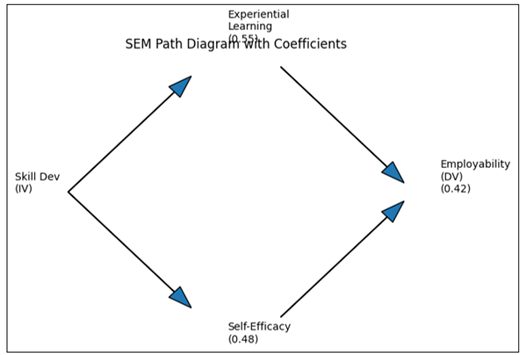 Figure 3 SEM Path Diagram with Coefficients Figure 3 is a graph that demonstrates the associations between variables and therefore, experiential learning and career self-efficacy serve as crucial mediators. It emphasizes that the skill development programs are not only directly effective in enhancing employability but also by expanding the learning experiences and student confidence. 6. Discussion The outcomes of this research have a high empirical value to the proposed conceptual frameworks because they indicate the high relevance of industry-based skill development programs in improving the employability of management students in Tamil Nadu. These findings support the hypothesis that such programs not only affect employability directly in a positive way but also affect the development of employability indirectly, through experiential learning and career self-efficacy, which proves the multidimensionality of the development of employability. The hypothesis of a direct correlation between the industry-oriented skill development programs and the employability (H1) implies that the systematic exposure to the industry practices, i.e. internships, live projects, programs certification, etc., is a key factor in equipping the students with the necessary workforce skills. This observation conforms to the available literature that has stressed on the significance of matching academic curricula with the demands of the industry. It shows that students active in such programs are in a better position to acquire practical skills, professional awareness, and employment preparedness skills. The findings also indicate that industry based programmes contribute to a great extent in improving the experiential learning (H2) which positively influences employability (H3). This supports the ideas of experiential learning theory that postulates that the best way to learn is by being engaged and active and practicing what one has learned. The high correlation between skills development courses and on-the-job learning emphasizes the need to add practical, practice-oriented elements to the management learning. Experiential activities help students acquire critical thinking, problem-solving and decision-making skills which are critical to employability. On the same note, the research verifies that industry-oriented programs affect career self-efficacy (H5) positively, and career self-efficacy (H6) has a significant effect on employability. The discovery highlights the psychological aspect of employability, which implies that the belief in individual capabilities is just equal to the learning of skills. Students who feel competent take initiative in finding opportunities, do well during interviews and adjust to work related challenges. It is in line with the social cognitive theory which emphasizes self efficacy in determining performance and behavioral outcomes. The mediation analysis sheds more light on the processes that stand behind these relations. The high level of mediating effect of experiential learning (H4) states that the success of skill development programs is partially achieved through the learning experience that it offers. Similarly, the mediation effect of career self-efficacy (H7) implies that the programs increase employability by increasing the confidence and motivation of students. Notably, another mediation effect also exists in the study in terms of a chain mediating effect (H8), which is that experiential learning leads to better career self-efficacy, which in turn results in enhanced employability. The sequential pathway emphasizes that there is an interactive relationship between learning and psychological development in the process of shaping career outcomes. Comparing the research results with the previous literature, the results obtained in the given research study are in line with the previous research that underlines the significance of self-efficacy and experience in education and career development. Nevertheless, the research also contributes to the area by incorporating these variables into one construct and testing their interaction empirically with regard to management education in Tamil Nadu. This contextual orientation is a value addition to the available body of knowledge because most of the previous studies have been done in other geographical or discipline setting. Educational institutions and policymakers are also interested in the implications of the results. Experiential learning is very strong and therefore it implies that the traditional approach of teaching should be supported by practical activities that are industry-related. Equally, career self efficacy role indicates the necessity of career-building interventions that develop students confidence which includes mentoring programs, career counseling and skills-based training. Incorporating these elements into the curriculum, the institutions will be able to develop a more comprehensive learning environment that will not only improve the acquisition of skills, but also improve the psychological preparedness. Overall, the discussion proves that the concept of employability can be characterized as a complex phenomenon that depends on educational practices and psychological individual factors. The programs of industry-oriented skills development can be viewed as a stimulus to engage experiential learning and build self-efficacy that can eventually result in a better employability outcome. These findings support the necessity of an integrated approach to management teaching with theory, practice, and personal development being aligned to the needs of the contemporary working environment. 7. Implications and Recommendations The results of the current research can produce important effects on the educational establishments, policymakers, and the representatives of the industry due to their emphasis on the need to implement industry-focused practices, hands-on learning, and mental growth in management education in order to 