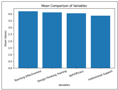 Figure 2 Mean Comparison of Variables As seen in the graph in Figure 2, teaching effectiveness (Mean = 4.20) has the highest score, which means that participants have perceived a lot of improvement after taking design-thinking training. The positive role is also confirmed by design-thinking training (4.12) and self-efficacy (4.05). Nonetheless, the institutional support (3.88) is rather modest, which implies that the organizational support should be enhanced to achieve the maximum of training results. Figure 3
