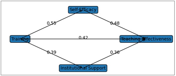 Figure 3 SEM Path Diagram Figure 3 demonstrates that faculty training on design thinking has a positive influence on teaching effectiveness with a strong positive relationship ( = 0.42). It also contributes greatly to self-efficacy (0.55) as well as institutional support (0.39). Self-efficacy amounts to the most significant effect on teaching effectiveness among the mediators ( = 0.48), and then there is institutional support ( = 0.36). On the whole, the graph validates that training has a direct and indirect positive effect on teaching performance, with self-efficacy as the most significant mediator, and institutional support as the significant supporting factor. Figure 4