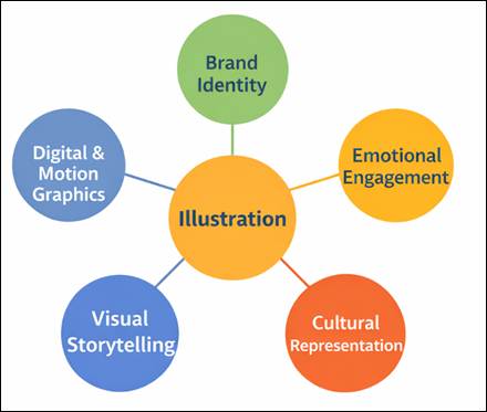 Figure 1 Role of Illustration in Indian Advertising Narratives 3.1. Illustration as a Tool for Brand Identity Creation Brand identity is the perception of the brand by the audience and illustration is very important in building and strengthening the brand identity. Illustrations are different to standardized photographic images and can be customized in a unique way to portray the personality, tone, and values of a brand. This personalization helps brands to develop a unique visual language that makes them stand out among others. Illustrations are commonly employed to create mascots, icons and repetitive visual elements in Indian advertising to create brand recognition. These factors bring uniformity on various platforms such as print, television and online media. As an illustration, colorful and light-hearted illustrations are common among brands that are aimed at younger audiences, whereas minimalistic and elegant designs are used in premium brands. The flexibility that illustration gives enables brands to be consistent in identity and change with the passing times so that the recall and familiarity among consumers can be reinforced. 3.2. Emotional Engagement through Illustrated Content One of the factors that determine whether advertising is effective or not is the emotional engagement and illustration forms a major part in creating emotions. Illustrations have the power to convey emotions of happiness, nostalgia, excitement and empathy through expressive figures, symbolic images as well as dynamic compositions. Thead of family, relationships, and Indian values are a common aspect of advertising in the Indian context. Through illustrations, the advertisers can portray these themes in a relatable and stylized way that would make them more emotional. As an example, the warm color schemes and cheerful visuals are common in festive campaigns to promote a feeling of celebrations and unity. Likewise, the social awareness campaigns are minimalistic and powerful in using illustrations to send serious messages and be thought provoking. The illustration establishes a bond between the audience and the brand, as it makes difficult feelings visually appealing, creating trust and future loyalty. 3.3. Representation of Indian Culture, Traditions, and Diversity Cultural diversity in India offers some exceptional opportunities to advertisers to develop meaningful and relatable content. Illustration is a powerful way of expressing this diversity as it includes details like traditional clothing, art forms of a region, festival, and surrounding landscapes. Culturally rich stories are often done using illustrations that are inspired by traditional Indian art forms such as Madhubani, Warli, and Pattachitra. These styles make it more real and relevant to the viewers, as they echo familiar cultural aspects. Culturally-themed illustrations are frequently used by brands during festive seasons to make their message more in tune with the feelings and customs of the event. In addition, through illustration inclusive representation is possible, as various characters and social situations are represented. This inclusiveness is critical towards responding to the diverse tastes and experiences of Indian consumers, which enhances the reliability and interest. 3.4. Storytelling Techniques using Illustration Illustration is an effective storytelling mechanism that allows advertisers to build interesting narratives using the visual medium. Through characters, settings and sequences, stories that convey brand messages can be illustrated using illustrations. Sequential storytelling is one of such techniques as several frames or panels depict various parts of a story. This method is more effective especially in the digital media, where the content can be interacted by scrolling or swiping. The other strategy is the use of mascots or repetitive characters that help to lead the story and bring continuity to the campaigns. Symbolism and metaphor are also used to depict abstract concepts in illustrations. Ideas like growth, innovation, and sustainability can be represented graphically in the form of symbols, which are easier to comprehend and are more captivating. Storytelling, especially with humor, fantasy and cultural allusions are common in Indian advertising and are well presented with the help of illustrative techniques. 4. Impact of Illustration on Audience Perception The way the audiences perceive, interpret and react to the message communicated ultimately determines the effectiveness of advertising. Illustration, in this regard, has a great influence in perception of the audience, as it affects the way the audience thinks, feels and acts. Since visuals can be processed more quickly than any textual data, illustrated material can immediately attract attention and have long-term effects. This part looks at how illustration affects perception of the audience in Indian advertisement, in terms of brand recall, consumer involvement, appeal to eyes, targeting demographics, and effectiveness in comparison. 4.1. Influence on Brand Recall and Recognition Memorability of the brand is one of the main aims of the advertising, it makes the brand memorable to the consumer. Illustration is also a major factor in brand recall where unique and attractive illustrations are formed, which are easy to identify and recall. In contrast to generic photographic images, illustrations can be specially created to capture brand identity and thus are easily recognized in a highly crowded advertising space. The cognitive psychology studies suggest that human beings are more likely to remember images than text, this effect is commonly known as picture superiority effect. Advertisements that use this effect are illustrated ones that use a combination of both visual attractiveness and storytelling as a way to make them more memorable. Illustrations can be used in Indian context where consumers have been subjected to multilingual content, as this could be
