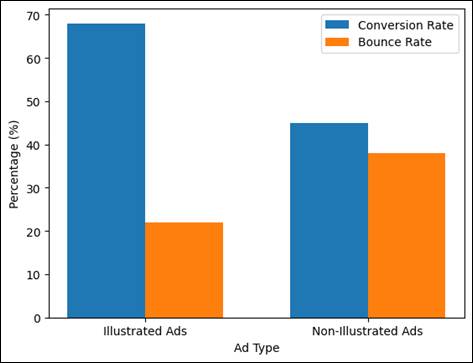 As the Table 2 shows, the illustrated advertisements perform better in all measures considered compared to non-illustrated ones. Emotional connection (88 percent) is the most improved, which means that illustration increases the connection of the audience with the brand. There are also significant gains in brand recall and engagement, which proves that rich content based on visuals is better to remember and engage. The positive change in the purchase intention indicates that illustration has a positive impact on consumer decision-making. Figure 2