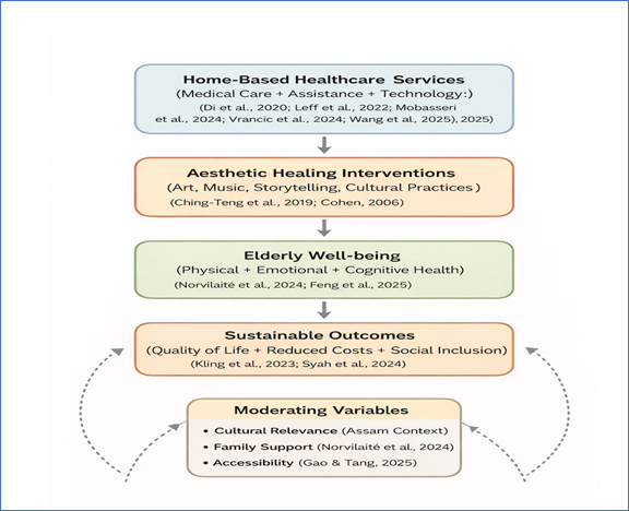 Gap Although the available literature offers important information about home-based healthcare systems, experiences of the elderly, technological advances and quality of services, they are mostly based on the clinical, functional, and technological aspects of care. A significant gap in the literature on the combination of aesthetic and cultural healing practices into these models is present. In particular, the impact of visual and performing art, including music, narrative and cultural ceremonies, on improving the well-being of older people, has been underestimated. It is this gap that makes the need to adopt a more holistic and culturally based practice that the current study tries to fill by considering aesthetic healing as an integral component of sustainable home-based healthcare. 5. Conceptual Model The current research offers a theoretical framework based on the combination of home-based healthcare services and the interventions used in the aesthetic healing to attain the sustainable results in elderly care. The model is based on the fact that in order to provide effective elderly care the treatment should not be, limited to clinical care but should also encompass emotional, cognitive and cultural aspects of health. At the bottom level, home-based healthcare services include medical care, daily assisting, and applying supportive technologies. The services enhance access and continuity of care and patient satisfaction and lessen the reliance on institutional healthcare systems Di et al. (2020), Leff al. (2022), Mobasseri et al. (2024). Furthermore, efficiency and safety of the care are improved with the use of technological innovations like smart home systems and home treatment optimization Vrančić et al. (2024), Wang et al. (2025). Elaborating on this background, the model proposes aesthetic healing interventions as an imperative integrative feature. These interventions involve participation in art, music, storytelling, and culturally oriented practices that have been demonstrated to have a substantial positive effect on the emotional well-being of elderly people and the symptoms of depression Ching-Teng et al. (2019). Moreover, involvement in culturally relevant artistic practices stimulates the cognitive functioning and sense of mission, and thus leads to the overall psychological health Cohen et al. (2006). Considering the Assam context, the practices are so integrated into the daily lives, that they are very effective and relevant to settings. Combination of home-based care and aesthetic care results in enhancement of well-being in older adults, which is theorized in three dimensions of physical, emotional, and cognitive well-being. Physical health is provided by home-based healthcare based on medical assistance, whereas emotional stability and cognitive ability are improved by aesthetic interventions. Research has demonstrated that an individualized and holistic approach to care has a great impact on enhancing the total experience and satisfaction of older citizens Norvilaitė et al. (2024), Feng et al. (2025). Such improvements eventually lead to a sustainable outcome, which is the improvement in the quality of life, lower healthcare expenditures, and social inclusion. Home-based care has a lower cost of admission and hospitalization, and it is economically viable Kling et al. (2023). Meanwhile, socialization and cultural involvement promote inclusion and community involvement, which both are fundamental to the long-term well-being Syah et al. (2024). These relationships also have key moderating variables that are also included in the model. The cultural relevance especially in the Assamese setting is of significant relevance in the decision-making of the acceptability and the effects of the aesthetic interventions. Established cultural beliefs increase the interest and emotional appeal, which boosts the care performance. The other moderator that is essential is family support because family involvement offers emotional stability and strengthens caregiving activities Norvilaitė et al. (2024). Also, the viability and performance of home-based healthcare delivery is defined by the accessibility of services, such as access to resources and infrastructure Gao and Tang (2025). Figure 1
