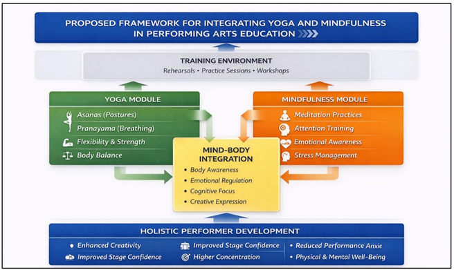 et al. (2019). 6. Expected Outcomes and Educational Benefits It is anticipated that the implementation of yoga and mindfulness measures in the process of performing arts education should yield important results in both the artistic performance and the general well-being of performers. The conventional performing arts training focuses mainly on training of skill, discipline of rehearsal, and presentation on stage. Although the aspects are crucial in building artistic competence, they do not usually consider the relevance of the mind, emotional control, and the body. The offered framework presents a holistic approach to learning where mind-body practices are combined to help a performer to have balanced artistic and personal growth. Kumar and Jadhav (2023), Mirajkar et al. (2023) With the introduction of yoga and mindfulness training and exercises into the context of performing arts training programs, educational institutions will be able to develop learning environments that foster creativity, concentration, emotional stability, and performance confidence. The anticipated results of the proposed framework are not limited to artistic performance and lead to the fact that artistic performers will develop their physical, psychological, and creative abilities in the long term. Ganesan et al. (2025) 6.1. Improvement in Artistic Creativity One of the main elements of performing arts is creativity because the performers are required to understand artistic works, demonstrate emotions, and create their own performance styles. Mindfulness is a practice that helps performers develop ways of being in the present moment, receptive to new experiences, which can result in creative thought and artistic discovery. Being more conscious of the thought and feelings, performers can get in touch with their creative processes and come up with new ideas of artistic expression. Yoga practices are also helpful in enhancing creativity through body awareness and control of movement. Dancers are able to experiment with new gestures, movements, and expressions in the course of rehearsals because of the higher level of physical awareness. This increased relation of the mind and body enables the performers to perceive artistic material in a more authentic and creative way. Consequently, students can possibly show even better improvisation abilities, better emotional articulation and increased originality in their performances. Rawandale et al. (2025) 6.2. Enhancement of Emotional Well-Being The artistic performers frequently face stressful situations because of the intense training, competitive conditions, and anxiety over the performance. In the absence of proper emotional regulation strategies, the students might develop anxiety, burnout or lack of motivation. The suggested framework will solve these dilemmas by considering the practice of mindfulness to enable performers to achieve emotional mindfulness and resilience. Mindfulness meditation teaches people to perceive their thoughts and emotions without judging them in an attempt to lower stress levels and emotional stability. Regular mindfulness practices help participants to have more healthy reactions to performance pressure and balance their emotions on the rehearsals and on the stage. Also, yoga activities allow body relaxation and lessening physical stress, which can also help to make emotional well-being better. These advantages provide a conducive learning atmosphere in which the performers are more confident, motivated, and evenly emotionally balanced to be involved more efficiently in an artistic activity. Venkata et al. (2025) 6.3. Development of Concentration and Stage Presence Successful performing artists need to have concentration and stage presence. Musicians have to be very concentrated when performing complicated moves, lines, or playing music. Distractions, anxiety and mental fatigue may be detrimental to concentration and may diminish the quality of performances. Mindfulness meditation is also very important in enhancing the attentional control and cognitive concentration. Mindfulness training would teach the performers to focus their minds in the current moment that would assist them to be completely engaged when rehearsing and performing. This increased focus allows the performers to react better to the dynamic stage conditions as well as to be consistent in their performance. Moreover, mindfulness exercises also allow performers to become more presentable on the stage, being more self-aware and confident. When the performers are completely alert and conscious of their movements, expressions as well as their feelings, they are able to communicate better with their audience. This enhanced stage presence leads to better performances which are more convincing and effective. Hazarika et al. (2025) 6.4. Reduction of Performance Anxiety Anxiety about performance is among the widespread issues of performing artists. Students are usually nervous, fearful of failure and psychologically pressurized during or before performances. Such symptoms may hamper concentration, lower the quality of performance, and have negative impact on the confidence of performers. The given model deals with performance anxiety by applying yoga and mindfulness practices jointly. Yoga breathing exercises like pranayama assist in the regulation of body reactions that occur in relation to stress like heart rate and muscle tension. Respiratory control facilitates relaxation and determines better control of emotions enabling the performer to stay relaxed in stressful conditions. The mindfulness-based practice can also assist the performers to be more aware of their thinking and feeling, therefore, they can be better able to deal with anxiety. Through the routine of mindfulness, performers can be able to learn how to recognize nervousness without letting it make them feel overwhelmed. Such performance anxiety management quality helps in achieving better confidence, concentration, and 