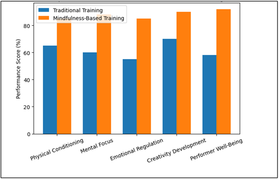 According to the results presented in Table 3, mindfulness-based training offers significant changes in all the parameters under assessment. Mental concentration, emotional control, and wellness are the key areas that become the most advanced, and they are directly affected by mindfulness meditation and yoga. 5.3. Graphical Representation of Results The graphical representation depicted below in Figure 4 indicates the comparison between traditional performing arts training and mindfulness-based training in the performance parameters that were chosen. Figure 4