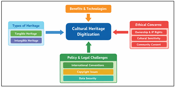 1. INTRODUCTION Cultural heritage refers to general memory, identity and historical heritage of societies in the world. It includes both tangible and intangible objects that include monuments, manuscripts, artifacts, artworks and archaeological sites and include traditions, rituals, languages and performing arts and oral histories. Cultural heritage ought to be retained in order to maintain continuity of culture, bring about social cohesion, and also enable the future generation to be aware of the historical and cultural background of the human civilization. However, many cultural heritage sites are at stake because of natural calamities, erosion, urbanization, armed conflicts, physical material decadence and other causes. Digital technologies are increasingly becoming powerful tools of recording, storing, and sharing cultural heritage resources to solve these problems Aormina and Baraldi (2022). It is possible to say that digitization of cultural heritage is the process of converting physical or intangible cultural objects into digital format that can be stored, managed and accessed with the help of digital media. The history of technologies of high-resolution imaging, 3D laser scanning, artificial intelligence, machine learning, and digital archiving systems enabled museums, libraries, and the cultural institutions to create detailed digital images of cultural objects and cultural practices. The technologies facilitate the possibility to record improved, possess slight remoteness, and interactively engage cultural resources Kelly and Taffe (2022). There is also the effect of digitization that allows the researchers and general population to access the collections of cultural heritage to cross geographical and institutional borders which enhances the opportunity of education and research. Despite these advantages, digitalization of cultural heritage has several complex ethical, legal, and policy-related consequences. Among the largest issues is connected with ownership and intellectual property rights of digitized heritage materials Gallou (2022). The cultural artifacts may be created by a specific community or indigenous group and the digitization process may bring issues on who ought to have the right to do so, create profit out of them or share such works with others. In addition to that due to the digital form of culturally sensitive objects, spiritual traditions, or community knowledge, there may be ethical issues of appropriation, misrepresentation, or misuse of heritage materials Ateca-Amestoy et al. (2021). These problems also highlight the necessity to include the local populations and cultural stakeholders in digitization process. The legal frameworks and the policy are also essential in determining the way in which digital heritage projects are regulated. The policies and laws of the international conventions, both national and copyrights provide a guideline, as to how the cultural resources are to be safeguarded, and the control of the digital access to the collections of the heritage Knapik and Król (2023). Figure 1 shows the ethical governance and policy factors that will lead to cultural heritage digitization. However, as there are inconsistencies between legal systems, as well as, the fact that digital technologies are evolving at a very rapid pace, it is usually difficult to control the digital heritage materials because of the gaps in the regulations. Figure 1