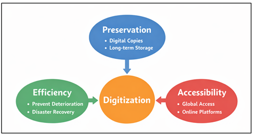 3. Concept of Cultural Heritage Digitization 3.1. Definition and types of cultural heritage (tangible and intangible) Cultural heritage can be defined as the physical and non-physical inheritance of past generations that are being preserved in the current generation to be passed on to the generation to come. It is the detachment of identity, tradition, knowledge systems and creative expressions of societies at various times. Broadly cultural heritage can be categorized into two main categories i.e. tangible heritage and intangible heritage. The tangible cultural heritage refers to the hardcopy cultural objects and locations that comprise of monuments, historical buildings, archaeological artifacts, manuscripts, paintings, sculptures, and museum collections. These material resources can be held in museums, archives, libraries and heritage sites where they serve as historic evidence and can be used to teach. On the other hand, intangible cultural heritage is non-physical cultural expressive forms including oral traditions, folklore, performing arts, traditional crafts, rituals, festivals, languages and indigenous knowledge systems. [12] 3.2. Role of Digitization in Preservation and Accessibility These methods are, however, not always effective in preventing environmental damage, aging, disasters or human conflict of cultural materials. Digitization provides another option as it is transforming the physical and intangible cultural assets into digital forms that can be stored, reproduced, and shared by using digital infrastructures. By means of digitization, museums, libraries and archives are able to produce good quality of digital copies of artifacts, manuscripts and artworks. These online images enable the cultural contents to be maintained despite the fact that the original objects may fall into ruins with time. Moreover, digital archives provide the opportunity to document and systematically catalog cultural resources over a long period. Figure 2