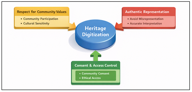 (2025) 4.2. Cultural Sensitivity and Representation Issues Ethical issues that should be taken into account in the digitization of cultural heritage include cultural sensitivity and representation. Cultural artifacts and traditions usually have profound historical, religious and symbolic connotations that are strongly associated with identity and values of particular communities. In cases where cultural materials are computerized and provided in the digital space, the chances of having these meanings misinterpreted, over-simplified, or not placed into the context of the culture are high. This misrepresentation may cause misunderstandings, stereotyping or the fact that the original cultural meaning of heritage objects or traditions will be lost. Some of the projects of digitization focus more on technological documentation even neglecting cultural narratives and social contexts that make heritage meaningful. As an example, digital archives can have artifacts as objects of visual representation but not describe how they became culturally relevant, used in rituals, or have a history. Cultural sensitivity, ethical representation, consent and community inclusion can be seen in Figure 3. This decontextualization can simplify complicated cultural practices into simplified digital images or records of data. Garro et al. (2022) Figure 3