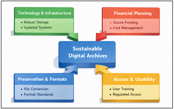Figure 4 Long-Term Sustainability Framework for Digital Cultural Heritage Archives The cultural institutions, including smaller museums and archives, might struggle to finance these resources on the long-term basis. The digital collections are at risk of becoming inaccessible or lost with time unless with a regular support of finances and institutions. 6.3. Data Authenticity, Integrity, and Security Digital heritage data are needed to assure trust in digital archives through ensuring the data is authentic, integrity and secure. When the cultural artifact and historical records are scanned and made digital, the generated digital records should be a true reflection of the original materials, devoid of distortion and unwusfulteration. Authenticity means the consistency and trustworthiness of digital documents, and they are accurate and unbiased depictions of the original cultural items. Unless an appropriate verification system is in place, the digital reproduitions can be modified, misunderstood or manipulated, which can invalidate the historical importance of the archive. Data integrity is the idea of preserving the quality of digital data accuracy and consistency. Venkata et al. (2025) 7. Case Studies of Digital Heritage Projects 7.1. Digitization initiatives in museums and archives Museums and other archival organizations all across the globe have been adopting digitization initiatives over the last couple of years as a way of preserving and disseminating cultural heritage materials. Large scale museums, libraries, and national archives have also initiated large scale projects, which involve scanning of manual documents, taking photographs of the objects, and creating digital descriptions of the historical items. These activities tend to produce high-resolution pictures, modeling three-dimensionally, and computer-aided cataloging systems to create elaborate online collections that are capable of being searched in information databases over the Internet. Digitization helps institutions to keep sensitive artifacts as the number of physical contacts to receive data is reduced, and scholars and the general public would be able to learn and analyze them on a case-to-case basis. Many museums have also established virtual exhibitions that provide cultural collections through the interactive internet platforms. By the use of these online galleries, the visitors can navigate through the artifacts, artworks and historical documents without having to physically move around the actual location of a museum and therefore enhance access to the heritage materials that are not physically provided by the real museum. Academic research also makes use of and now has searchable databases of digital archives which contain metadata such as historical context, provenance and conservation records. Patil et al. (2025) 7.2. Community-Driven Heritage Digitization Programs The heritage digitization programs are a community-based cultural preservation initiative in which the system of cultural preservation puts the local communities directly into the process of their own cultural preservation documentation and management. These projects encourage people to engage in the community, the use of local expertise and complex decision making at the community level as opposed to the past digitization projects that were solely motivated by the major institutions. Through the assistance of researchers and digital archivists, local communities, indigenous communities, and cultural organizations preserve oral histories, traditional practices and languages and cultural artifacts. Such programs normally involve the training of the community members on how to utilize such digital applications as audio recorder, video cameras, and digital archiving software. It is an active process of capturing their heritage as it provides communities with the right to document their heritage in their own terms as well as according to the priorities of the community. It also assists in making sure sensitive cultural material is treated with sensitivity and also in making decisions regarding the access of content to the public or limited content. The digitization of traditional music, storytelling, rituals, and indigenous knowledge systems, are especially relevant to community-based digitization to preserve intangible cultural heritage. These cultural forms are commonly passed by word of mouth and they are also vulnerable to extinction unless they are put in writing. 7.3. International Collaborative Heritage Preservation Projects International collaborative heritage preservation projects entail associations between more than one institution, government and research organizations of various nations. These programs are to conserve and catalogue culture with global historical importance or which is at risk because of conflict, environment threats, or natural calamities. Using international collaboration, organizations gain, exchange, and share expertise, technology, and financial resources to assist with large-scale digitization and conservation activities. Joint initiatives are usually aimed at the establishment of digital collections of rare manuscripts, archaeological excavations, and cultural objects that are inaccessible or can be damaged. In order to make digital collections compatible with digital collections in other countries, its researchers collaborate to establish standardized documentation practices, digital storage solutions, and metadata models. This type of cooperation also helps in sharing cultural knowledge and international awareness of a common heritage. The international collaboration is also important in the development of capacity as they offer training and technological assistance to the cultural establishments that have little resources in the resource-starved regions. 8. Conclusion One of the major steps towards the conservation and sale of the historical and cultural resources in the digital world has been digitizing the cul