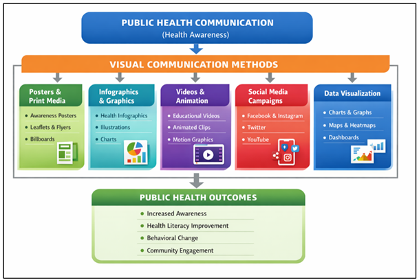 Figure 1 Visual Communication Methods in Public Health The Table 1 shows the key visual techniques that are employed in health campaigns by the state. It all boils down to public health communication whose focus is to create health-related information to the populace. Posters, infographics, videos, social media campaigns, and data visualization tools are some of the visual forms of communication that are essential in the simplification and presentation of intricate health data in an exciting way. These images enhance the comprehension and readability of messages at various levels of literacy. Therefore, positive visual communication helps to enhance health awareness, health literacy, positive behavior change, and community involvement in community health programs. 4.1. Existing Methods in Public Health Visual Communication Public health visual communication involves the application of visual representation as images, graphics, symbols and multimedia information to communicate health related messages to the masses. Given that most health information is sometimes complicated and non-experts might not understand it, the use of visual means of communication enables simplification of messages and makes them comprehensible by various groups of people. With time, various techniques have been devised and are extensively employed by governments, health organizations, and non-governmental organizations to encourage health awareness and disease prevention as well as behavioral change Nanchang et al. (2025). 1) Print-Based