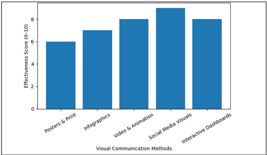 Figure 2 Effective of Different Visual Communication Methods in Public Health Figure 2 above is a graph that compares the effectiveness of the various visual communication techniques used in the public health campaigns in terms of the evaluation scores obtained through the common research findings on health communication literature. As the graph indicates, the social media visual campaigns are the most effective as they are likely to attain the highest score in the effectiveness because of the level of reach, information dissemination and the level of audience appeal. The effectiveness of video and animation-based communication is also high since it enhances understanding and memorization of the message. Infographics is better than a conventional poster since it can render the information in a visual, well-organized way that changes complicated concepts in health. High levels of effectiveness are also associated with interactive dashboards being able to present more detailed health data in a visual form though this might not be as deeply accessible. Vasanthan and Nandhini (2022) Table 2