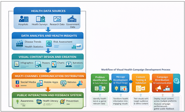 and Design Constraints Creating good quality visual communication tools takes talented designers, technological facilities and money to develop them. Some of the public health organizations, particularly of developing areas might not have access to professional tools of design or trained specialists in communication. This can lead to inability to design visual materials well hence less attention and ability to pass health information effectively. Jadhav et al. (2025) 7. Proposed Visual Communication Framework for Public Health Campaigns The public health campaigns should have proper communications strategies that ensure the society receives the right information about their health besides influencing them to change their behaviors positively. The conventional communication channels are able to utilize the written content or the bare visual contents that are not useful to address different populations with the diverse literacy levels. To address these weaknesses, the proposed study implies a Visual Communication Framework of Public Health Campaigns that would integrate the principles of the information design, digital media technologies, and through the use of multiple communication channels. The proposed model will be designed to simplify complex health information into simplified and appealing and socially relatable graphic messages that are easily understood by the masses. The framework is a set of the data-guided communication, visual design techniques, online platforms, and feedback channels of the audience that can aid the success and accessibility of health campaigns. The key points of the proposed framework are described in the subsections below. 7.1. Design Principles for Effective Health Communication In the case of effective visual communication in any campaign promoting the idea of health, it is crucial to establish the principles of the design that will be clear, accessible, and engaging. These values are used to design visual materials like posters, infographics, animation and digital graphics. Simplicity and clarity is one of the principles. The presentation of health messages must be done through simple graphic, minimum text, and clear graphical images so that, the information can be easily understood by the audiences with varying levels of literacy. Difficult medical terms need to be registered in simplified diagrams or step-by-step visual illustrations. Visual hierarchy is another principle that is required and arranges the information in a hierarchical fashion. Preventive measures, warning signs or emergency instructions should be displayed in important fonts, bold colors or at the center. Visual hierarchy is used to enable the audience to figure out the important information easily. It is also essential to have consistency in design elements. The constant color schemes, icon styles and layout structures enhance readability and recognition. Indicatively, medical information is frequently represented in certain color code in health campaigns like red color when there is a warning or green color when there is a safety message. Cultural sensitivity is a concept that is especially vital in communicating public health. The use of visual symbols, images and characters must be in a way that they are an expression of the culture of the target audience. Culturally relevant visuals that are designed promotes health message acceptance and understanding. Lastly, visual design should be done keeping the accessibility and inclusiveness in mind. The visual materials are supposed to serve the disabled or those with visual impairment or with limited access to digital materials. Increased color contrast, big fonts and alternative formats of communication helps in improving accessibility. 7.2. Components of Visual Health Communication Visual health communication entails a number of elements which interact together to provide effective health messages to the masses. The first is the health data and information sources. Public health communication campaigns are based on reliable data of hospitals, health surveys, research organizations, and government bodies. Correct and evidence-based information will see visual materials present reliable information. The second element is creating visual content. Health communication and designers translate health information into a visual format including infographics, posters, charts, illustration and animation. The information design method assists in arranging the material in a presentation format that is easy to read and comprehend. The third element is channel and medium of communication. Visual health messages are channeled using the different platforms, such as social media networks, websites, televisions, mobile applications, and community information boards. Health campaigns can be more effective and have bigger reach to a greater number of people through the use of several channels of communication. Audience interaction and engagement is another significant element. The digital platforms enable the users of the information to engage with the visual data by commenting, sharing, conducting surveys, and providing feedback. Audience participation helps to gain appropriate insights into the way health messages are perceived and received. Evaluation and monitoring is the last component. The effectiveness of the campaigns can be evaluated using the following metrics: the audience reach, the level of engagement, increase in knowledge, and change in behavior. Assessment aids the making of organisations perfect their communication plans and enhance health campaigns in the future. 7.3. Proposed Visual Communication Architecture The proposed architecture will incorporate data sources, visual design modules and communication platforms within a single system which facilitates effective communication of public health. Figure 3