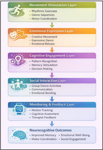 Figure 2 Poopsed Neurocognitive Movement Therapy Framework The Proposed Neurocognitive Movement Therapy Framework in Figure 2 is a combination of neuroscience, psychology, and expressive arts therapy principles to form an organized structure of movement-based cognitive therapy. The framework will be developed in the form of the multi-layer architecture, with every layer enhancing certain features of neurocognitive functioning. The framework is based on Movement Stimulation Layer. It also involves rhythmic activities, organized body movement, and organized physical activities that engage motor parts of the brain and arouse the neural connections related to balance, use of coordination, and body consciousness. The Emotional Expression Layer enables people to be expressive in expressing themselves creatively by use of movement and expression dance. This layer is used to discharge the emotional stress and psycholological health by involving the limbic system which controls the emotional reactions.Cognitive Engagement Layer is designed to stimulate the higher level functions of the brain like memory, attention and problem-solving. Dances involving pattern recognition and movement planning favor plasticity in the brain and cognitive flexibility. The Social Interaction Layer promotes group interaction and dancing. The social engagement enhances motivation, emotional attachment, and communication abilities that are requisite in psychological resilience. Lastly, the Monitoring and Feedback Layer defines therapist observations, motion tracking technologies, and cognitive assessments to analyze the progress of therapy and give feedback that is personalized. Combined, these layers create a complex therapeutic approach involving the improvement of motor capabilities, emotional, and cognitive health, which leads to the general neurocognitive well-being. Suri et al. (2025) 6. Expected Outcomes and Applications The suggested neurocognitive movement therapy framework implementation is likely to deliver numerous positive outcomes in cognitive, emotional, social, and physical fields. Combining the organized movement exercises with the principles of expressive arts and neuroscience, the framework fosters the overall well-being and helps people who are of various ages and health statuses. The next subsections explain the most important consequences and application of movement-based therapy in different situations. Table 3