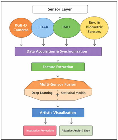 3. System Architecture for Multi-Sensor Fusion-Based Art Platform 3.1. Overall framework design The general architecture design of the multi-sensor based fusion-oriented art platform is the layered and modular architecture to make sure that they are scalable, flexible and can perform in real-time in dynamic outdoor setup. The system is structured into four major layers namely the sensor layer, data acquisition and preprocessing layer, fusion and intelligence layer, and the visualization/output layer. The sensor layer records multimodal data of various sources that is sent to the acquisition module where it is preprocessed, filtered, and synchronized. The fusion layer synthesizes digital information by utilizing hybrid computation models, which can be used to comprehend user interactions and the environmental contextualization. Lastly, the visualization layer creates dynamically artistic outputs in the form of projection systems or LED displays or AR interfaces. To reduce the latency and provide the real-time responsiveness, the edge computing components are included, as the cloud-based modules allow storing the data in large quantities and updating the models. Data exchange communication protocols are also part of the framework to work out smooth communication between distributed nodes. The modular design enables any new sensors and algorithms to be integrated easily, enabling the system to undergo constant evolution, and providing a strong and immersive experience in outdoor visual arts. 3.2. Sensor Layer (Visual, Motion, Environmental, Biometric Sensors) The sensor layer is the basic part of the system architecture, which is charged with capturing various data streams, which are indicative of user gestures and ambient factors. Sensors such as RGB and RGB-D cameras give high quality images and depth data to detect objects, recognition of gestures and understanding of scenes. This is supplemented by LiDAR sensors which can provide accurate spatial mapping and distance measurements and thus provide accurate outdoor environment and crowd dynamics modeling. Motionsensing is realized by using Inertial Measurement Units (IMUs), which record acceleration, orientation, as well as movement pattern of the users especially in wearable or handheld devices. Environmental sensors keep track of contextual values like temperature, humidity, ambient lighting value and air quality so that the system can adjust artistic outputs based on the changing outdoor conditions. Also, biometric sensors, including heart rate sensors, galvanic skin response sensors, may be introduced to deduce user emotional conditions and physiological reactions. 4. Proposed Methodology 4.1. Data collection in outdoor environments Outdoor settings are intrinsically complicated in data collection since they experience dynamic conditions, which include: changing illumination, weather changes, occlusions and unpredictable user actions. The suggested approach follows a distributed sensing approach in which a number of sensor nodes are distributed over the area of installation in order to achieve extensive coverage of the spaces. Every node would have a set of visual sensors (RGB/RGB-D cameras), LiDAR sensors, IMUs, and environmental sensors in order to survey different modalities at the same time. Continuous data acquisition with adaptive sampling rates is done to ensure a balance between the energy usage and the faithfulness of the data is achieved. In order to deal with the environmental variability, the calibration processes are conducted regularly such as camera intrinsic-extrinsic calibration and LiDAR alignment. Good data logging systems are enforced to store raw and processed data of real-time interaction and offline analysis. 4.2. Multi-Modal Feature Extraction Multi-modal feature extraction plays a very essential role in converting raw sensor data to meaningful representations that can be easily used by fusion algorithms. In the case of visual data, convolutional neural networks (CNNs) are used to derive spatial features (object boundaries, textures, and human poses) and depth information provided by RGB-D sensors are used to improve three-dimensional scene perception. Signal processing techniques and recurrent neural networks (RNNs) are used to obtain motion-related features by using IMU data to learn the temporal dynamics of the features such as velocity, orientation, and gesture patterns. The contextual patterns are identified with the help of the statistical descriptors and time-series analysis processing to address the environmental characteristics, i.e., temperature trends, variations in light intensity, and humidity level. Such methods as feature normalization and dimensionality reduction are used, which are principal component analysis (PCA) and autoencoders to provide computational efficiency and redundancy. Cross-modes feature alignment would be done to project various modalities into a common latent space, and coherent decoding of the multimodal inputs. This unified feature extraction mechanism enables the system to enable the complex interaction between users and their environment in such a way that given the rich and high level representations, the immersive art platform is more accurate and responsive. 4.3. Fusion Algorithm Design The design of the fusion algorithm combines the deep learning tools with the statistical models in order to produce strong, precise and real-time multi-sensor data fusion. The hybrid solution suggested above takes the best aspects of neural networks in terms of learning nonlinear relationships with complexities and that of probabilistic models in managing noise and uncertainty. The fundamental building block of the system is a multimodal deep learning system that jointly learns feature representations by visual inputs and taking into account temporal motions with either RNNs or LSTMs, and cross-modal interactions with attention systems based on transformers. Figure 2