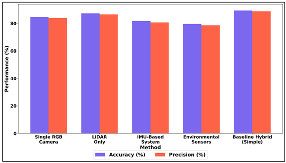 Table 3 will offer a comparative assessment of single-sensing and baseline systems and will reveal the drawbacks of using single sensing modalities. The single RGB camera gets an accuracy of 84.6, however, she works under varying light conditions and interested objects. Figure 4 compares accuracy, precision in the case of single sensor and hybrid approaches. Figure 4